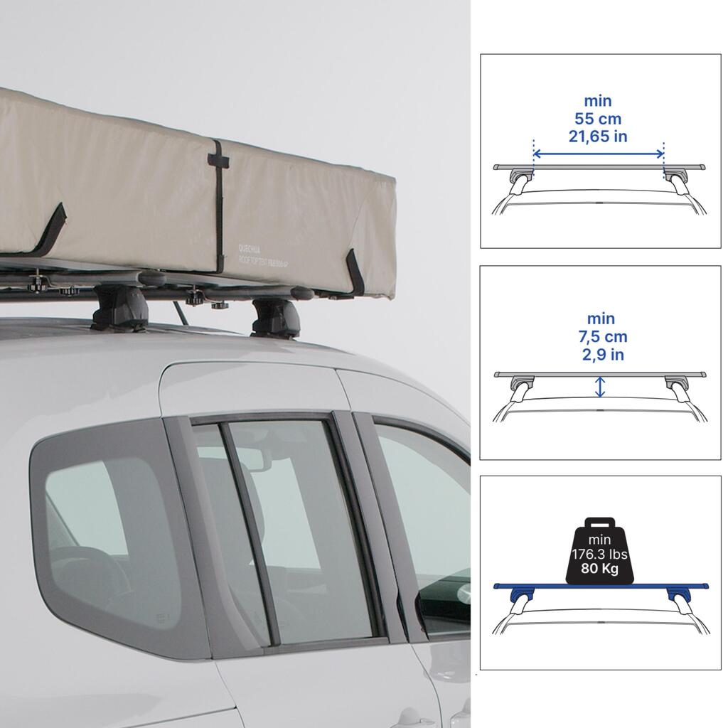 Minimalna razdalja med dvema strešnima palicama mora znašati 75 cm. Uporabna širina je 55 cm. Razdalja med streho in zgornjim delom strešnega nosilca mora biti večja od 7,5 cm, širina strešnega nosilca pa mora znašati manj kot 9,5 cm (glejte shemo med slikami izdelka). Pred vsako uporabo preverite, če so vaši strešni nosilci in šotor ustrezno pritrjeni.