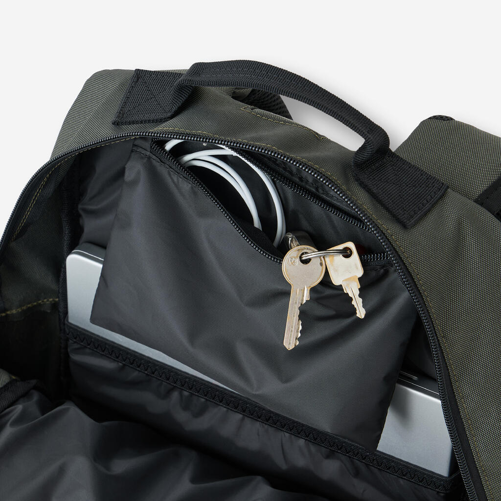 -velik osrednji žep (z majhnim žep z zadrgo znotraj in drugim žepom, v katerega lahko vstavite računalnik ali torbico za plastenko - ni vključeno)