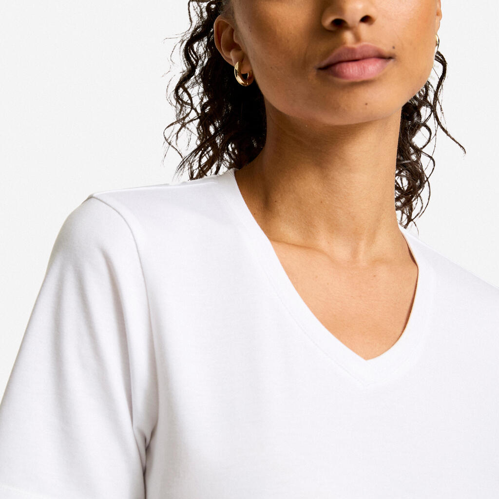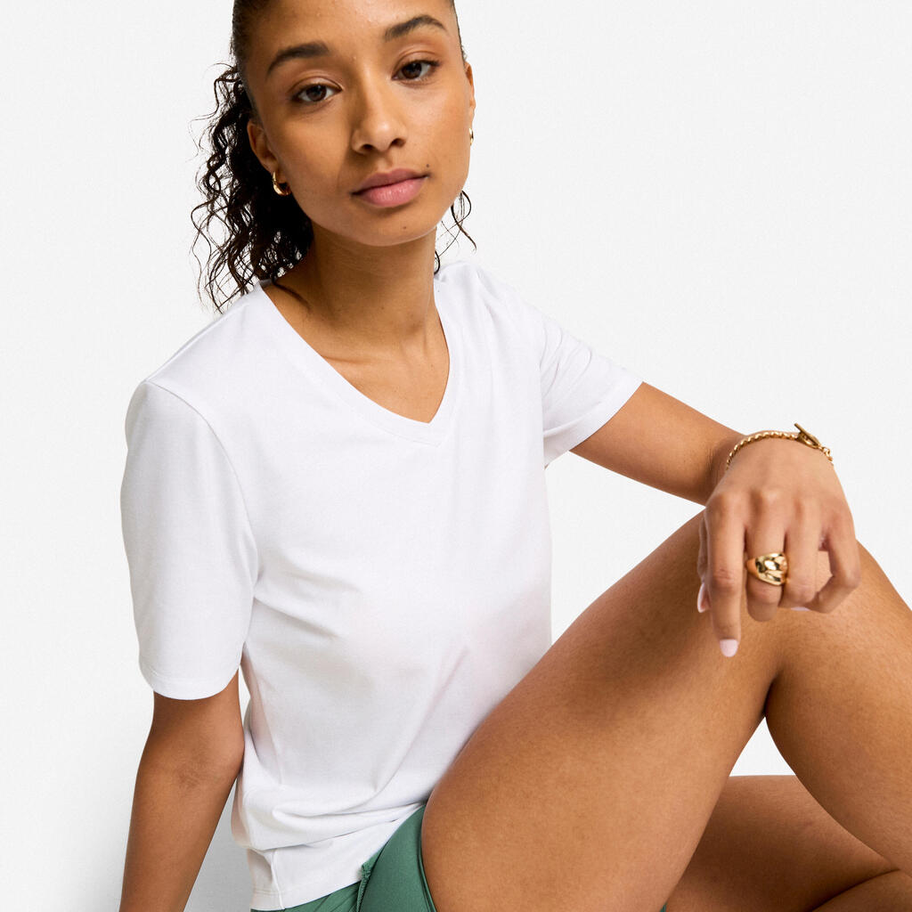 V-izrez zagotavlja ženstveni pridih z ravnim krojem.30 % modala zagotavlja padajočo obliko in mehkobo.Vlakna COOLMAX® vas med vadbo ohranjajo hladne in suhe.