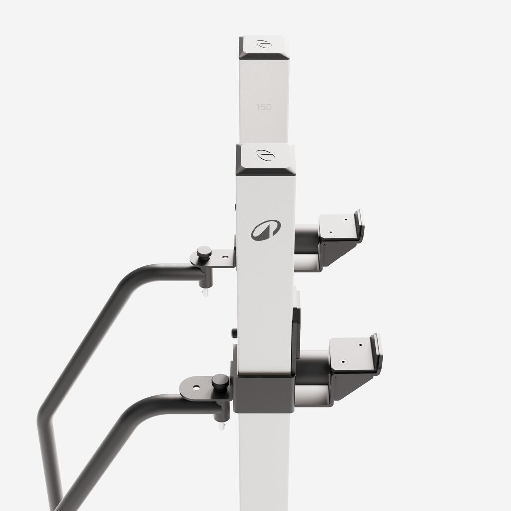 Da bi kar najbolje izkoristili to stojalo, ga združite s klopjo 1200 pro, ki se z enim klikom poveže in ustvari popolno postajo. Opremite se s 50 mm olimpijskimi palicami, odvisno od vaših potreb: 15 kg model (artikel. 8484131) ali 20 kg (artikel. 8491834). Opremo dopolnite z diski za dvigovanje uteži ali powerliftinga, kalibriranimi za natančne obremenitve. Varnostne objemke (artikel 8485052) pritrdijo uteži med dvigovanjem.Kar najbolje izkoristite vsak kvadratni meter prostora za vadbo moči.