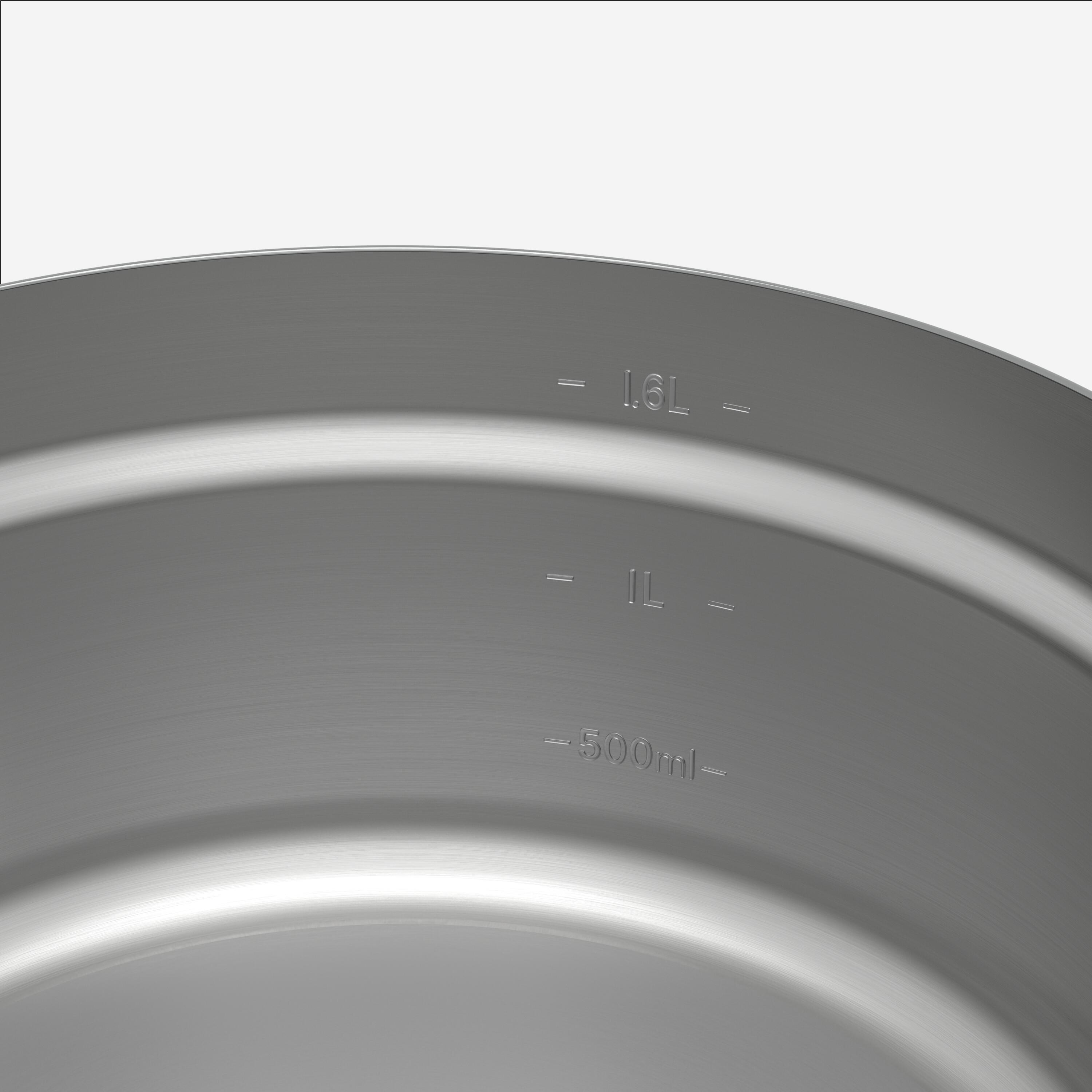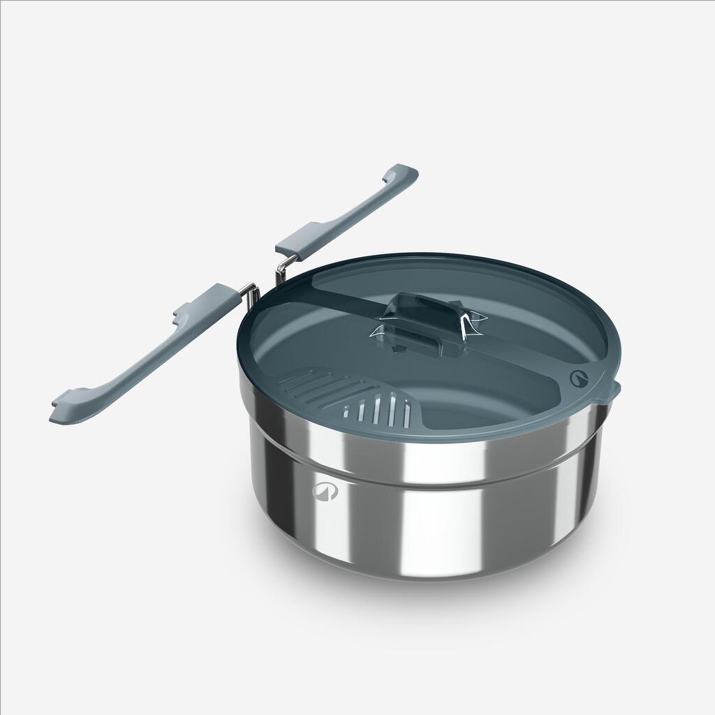 1 ponev s patentiranim zložljivim ročajem (1,6 l uporabne prostornine, 1,95 l skupne prostornine, 295 g, Ø 19.5 cm x 9.5 cm). 2 plitva krožnika (premer 17 cm, višina 3,7 cm, 61 g vsak). 2 kompleta pribora (vilica, žlica, nož) s sponko (20 g na komplet). 1 pokrov/cedilo (74,5 g). Za podaljšanje življenjske dobe kuhalnega kompleta lahko pokrov kupite kot nadomestni del (8901278) na naši spletni strani.