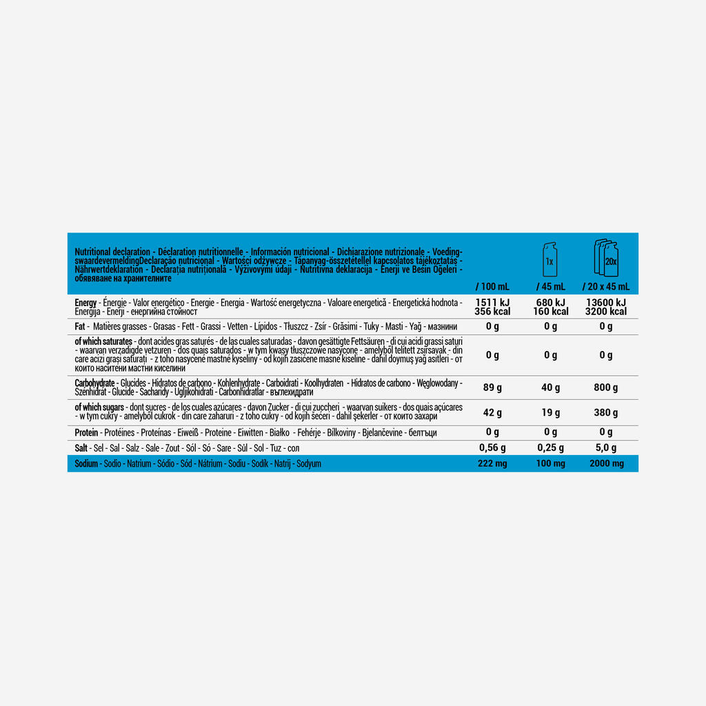 Dodatna energija za vožnje, daljše od 3 ur. 40 g ogljikovih hidratov v 45 ml gela. Razmerje glukoza/fruktoza 1:0,8: znanstveno potrjeno, preizkušeno in preverjeno s strani vrhunskih športnikov.