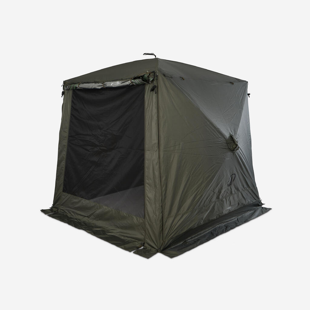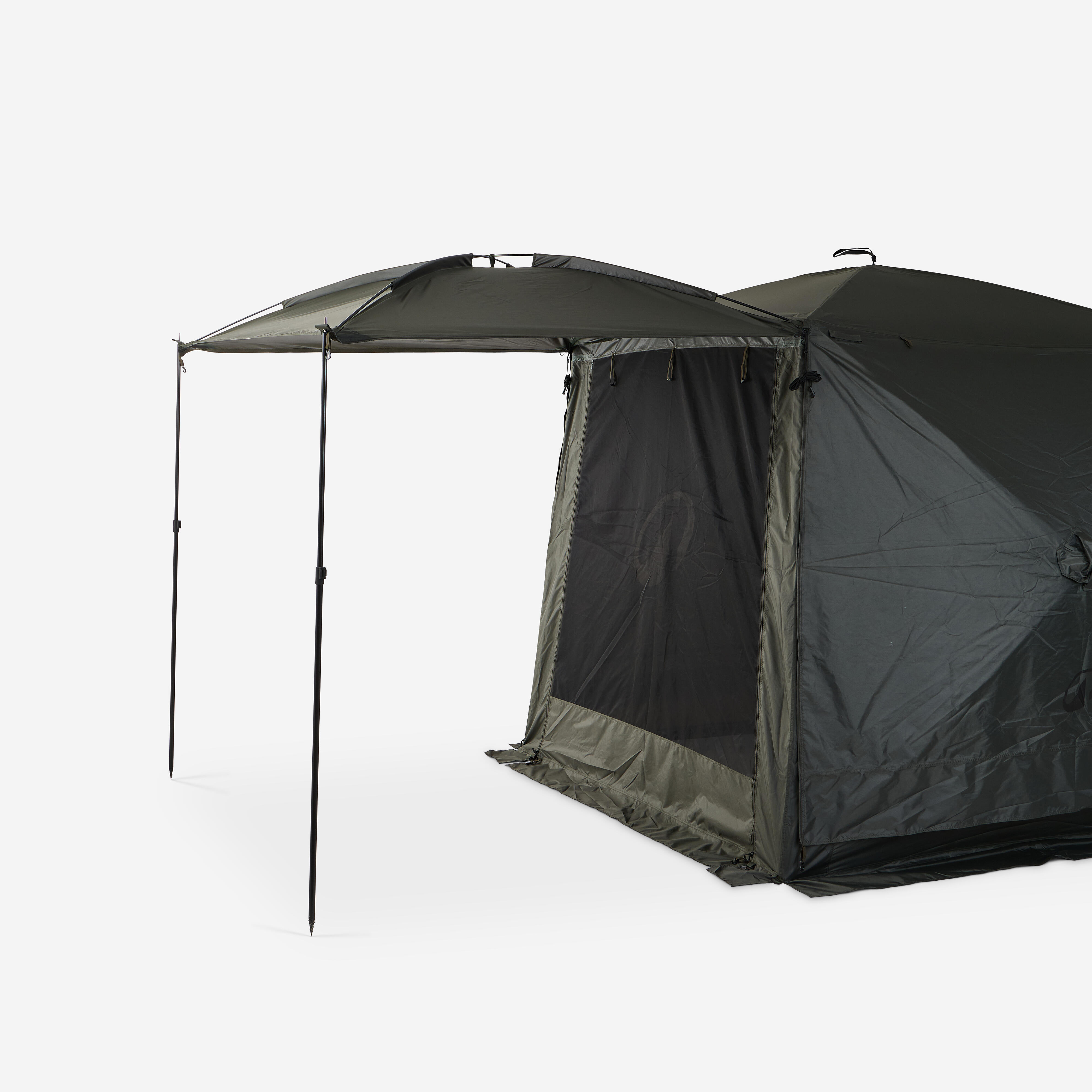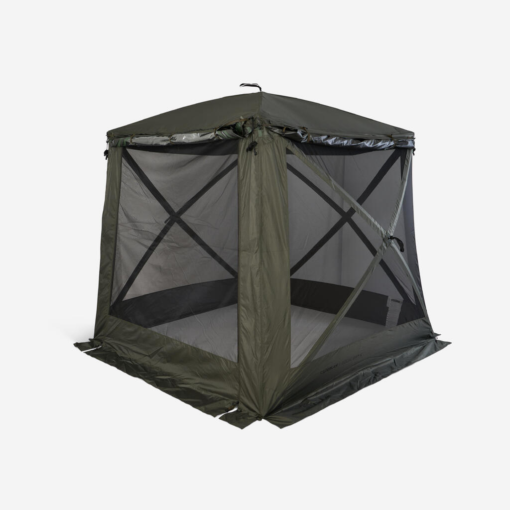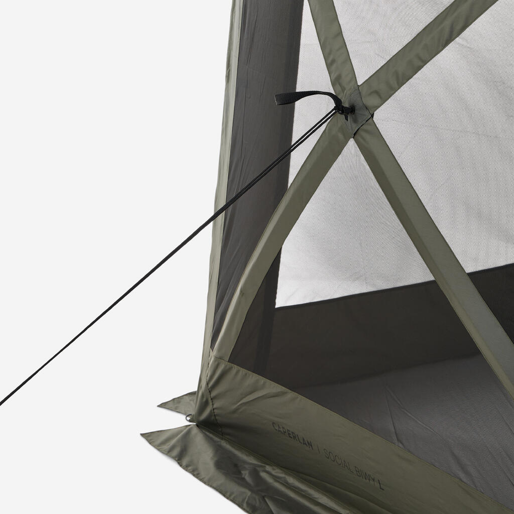 Paneli Social Bivvy so popolnoma modularni in se prilagajajo vsem pogojem. Uporabite jih v načinu komarnika za več svetlobe in prezračevanja ali v načinu cerade za učinkovito zaščito pred dežjem. Sprednja vrata z zadrgo lahko zaprete ali odstranite, da ustvarite široko odprtino. S kompletom tende lahko ustvarite zunanjo razširitev, zaščiteno pred soncem in slabim vremenom.