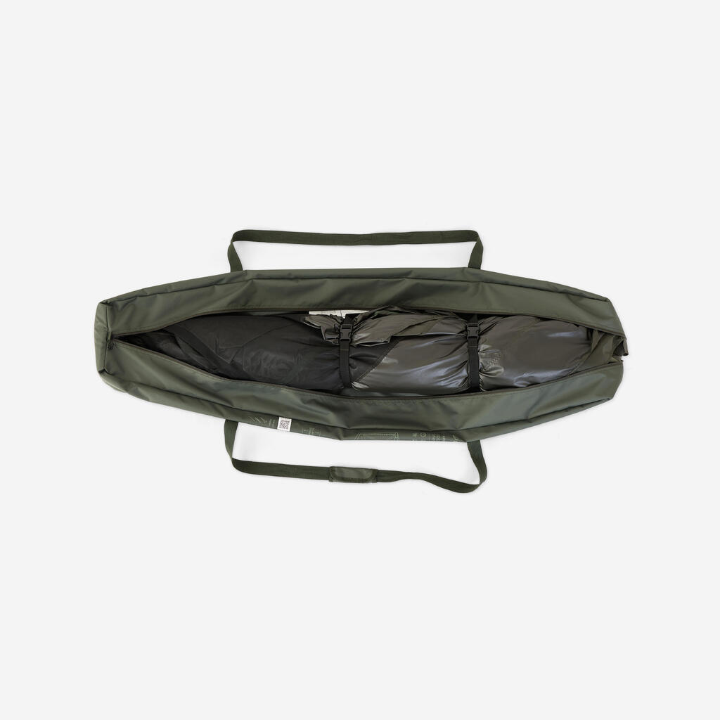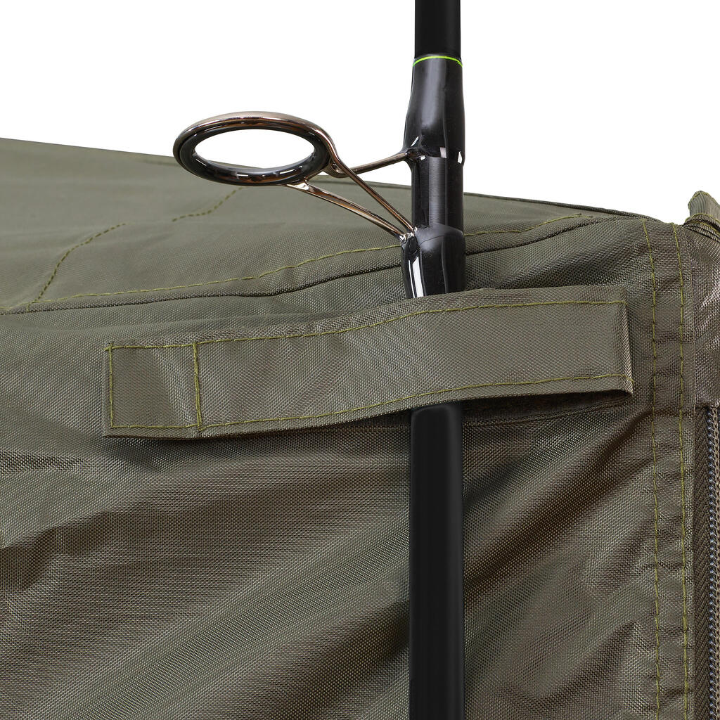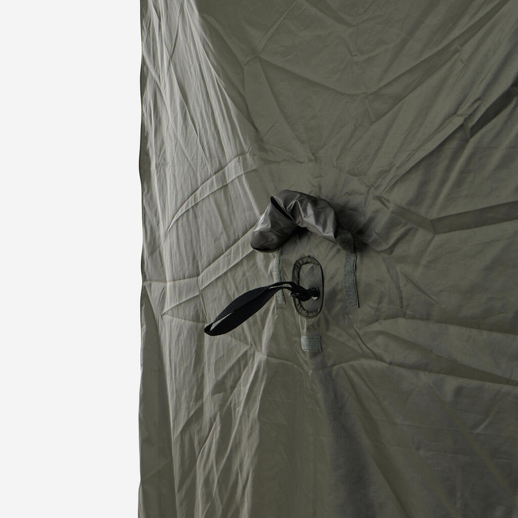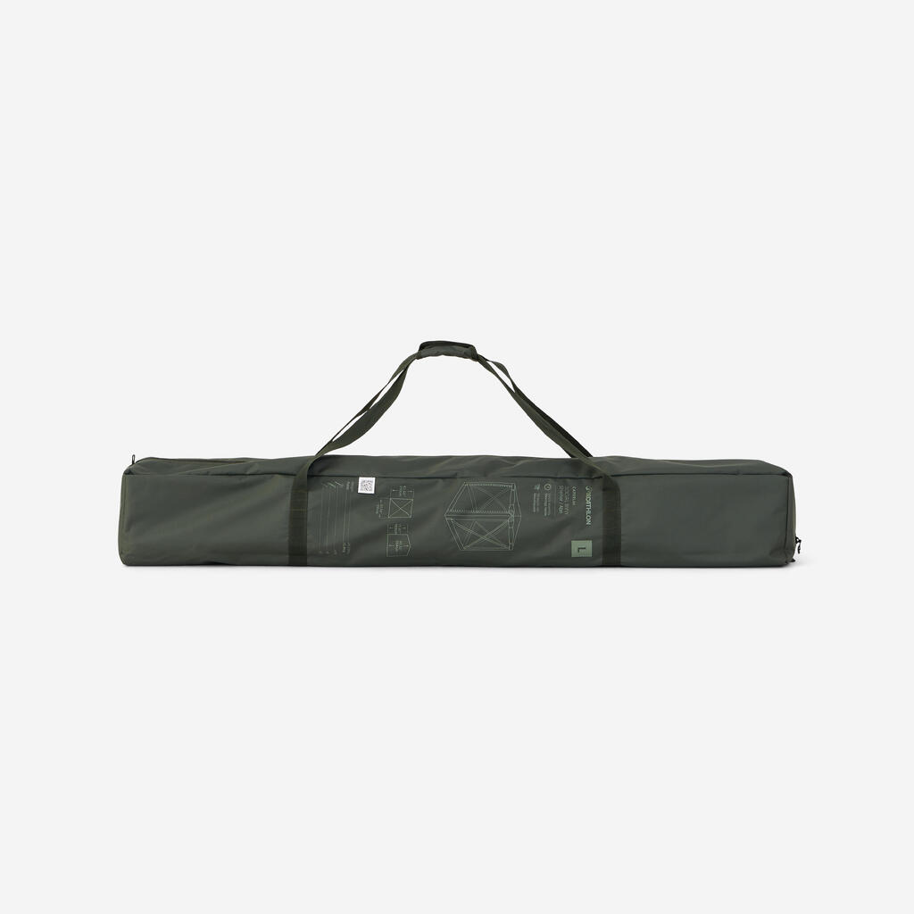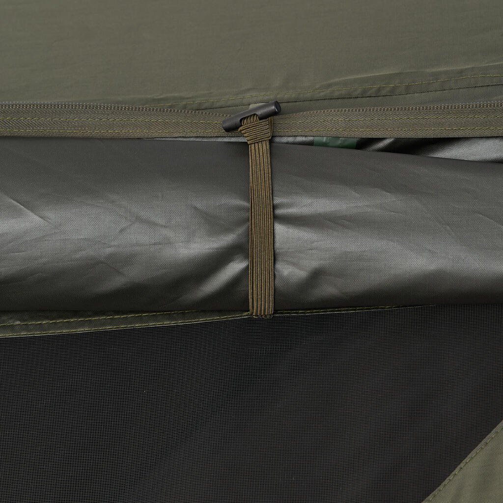 Paneli Social Bivvy so popolnoma modularni in se prilagajajo vsem pogojem. Uporabite jih v načinu komarnika za več svetlobe in prezračevanja ali v načinu cerade za učinkovito zaščito pred dežjem. Sprednja vrata z zadrgo lahko zaprete ali odstranite, da ustvarite široko odprtino. S kompletom tende lahko ustvarite zunanjo razširitev, zaščiteno pred soncem in slabim vremenom.