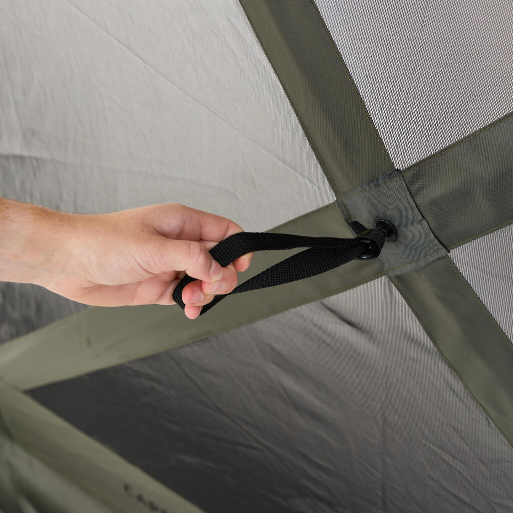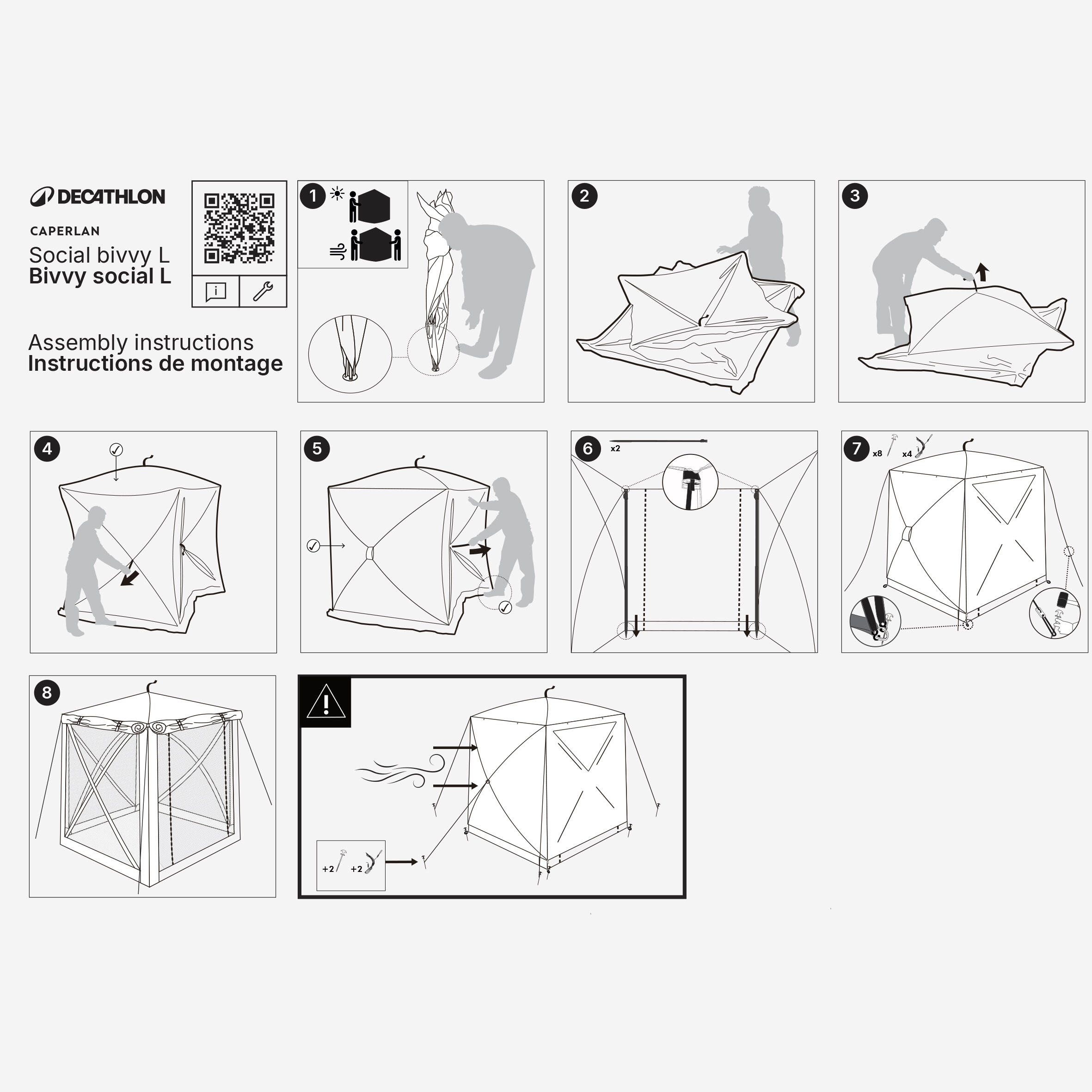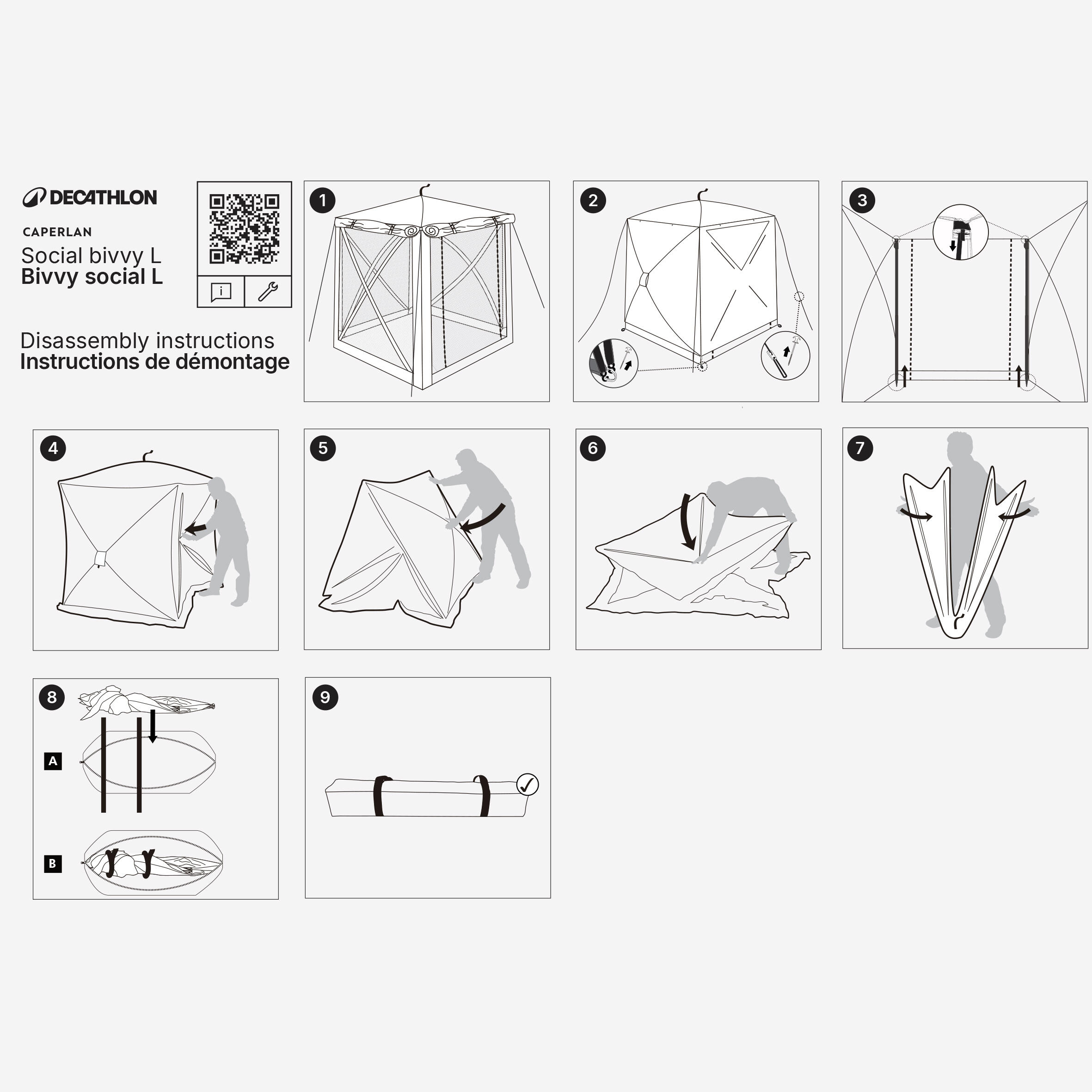 Social Bivvy je mogoče sestaviti v hipu, zahvaljujoč njegovemu izkočnemu sistemu. Vsak panel ima mehak sredinski ročaj: Preprosto potegnite za štiri ročaje (3 stranske panele in 1 stropni panel), da se obroči samodejno napnejo in oblikujejo konstrukcijo. Dizajn, ki omogoča hitro sestavljanje, tudi če ste sami.