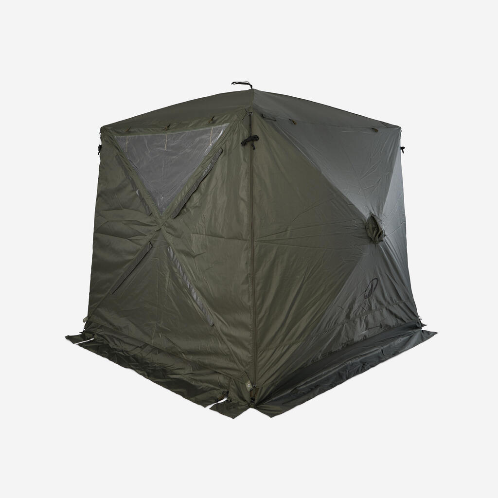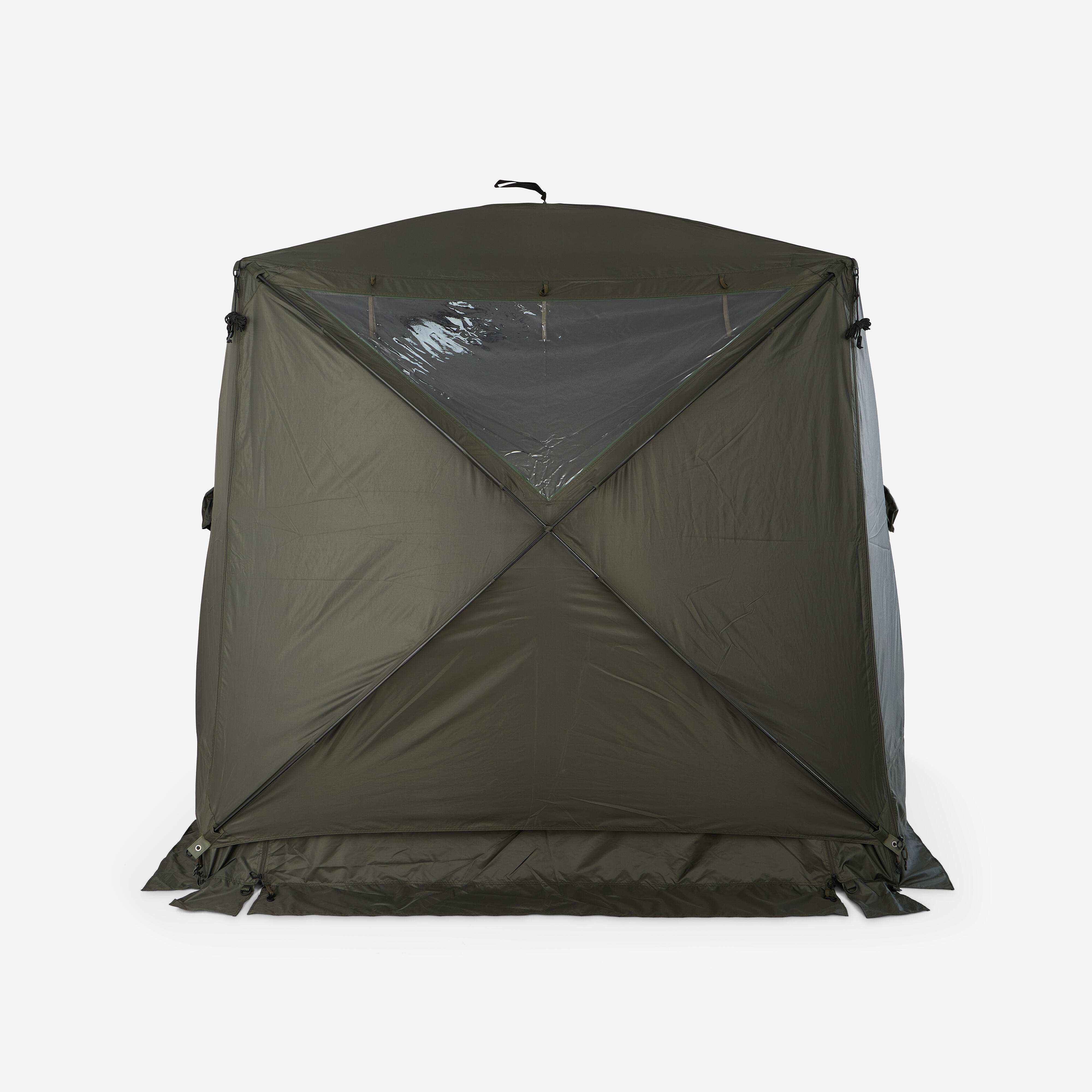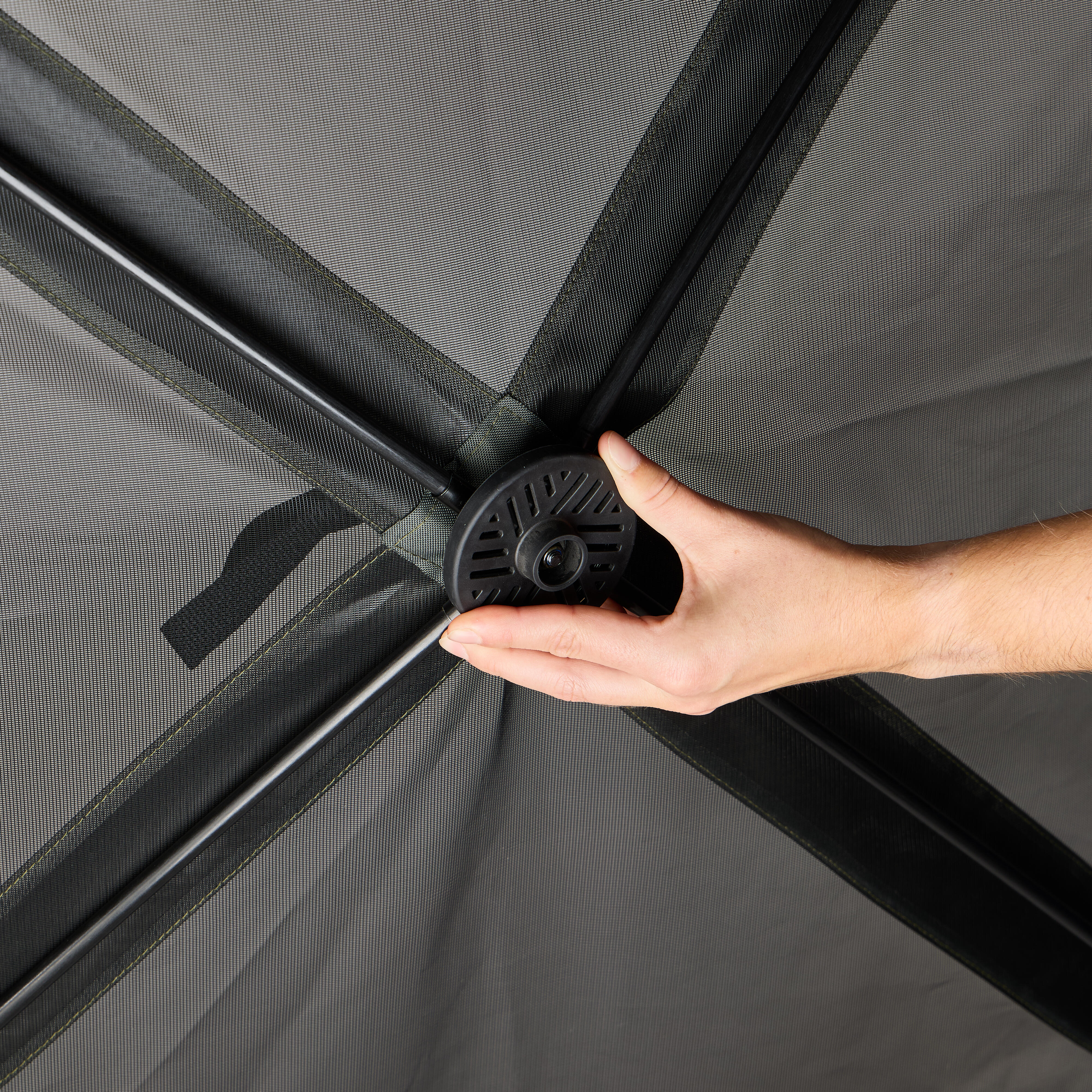 Social Bivvy je mogoče sestaviti v hipu, zahvaljujoč njegovemu izkočnemu sistemu. Vsak panel ima mehak sredinski ročaj: Preprosto potegnite za štiri ročaje (3 stranske panele in 1 stropni panel), da se obroči samodejno napnejo in oblikujejo konstrukcijo. Dizajn, ki omogoča hitro sestavljanje, tudi če ste sami.