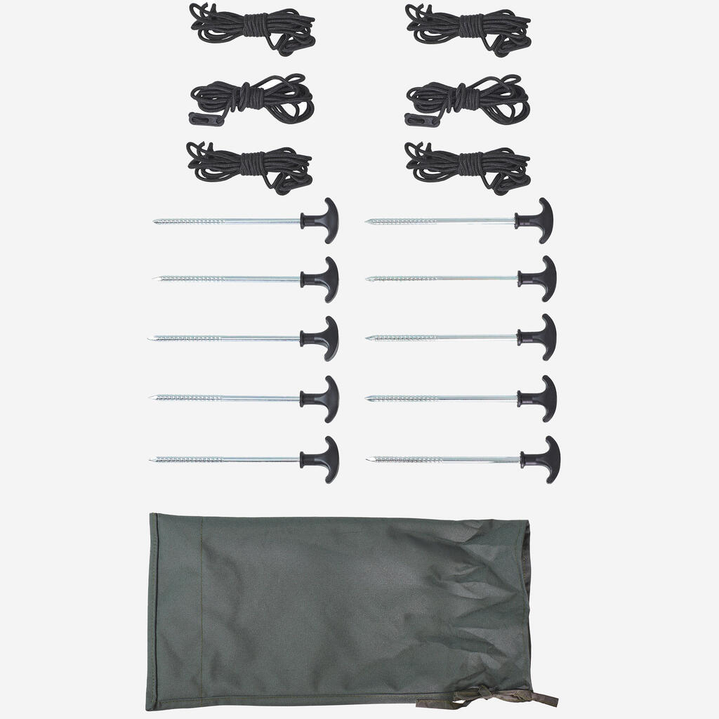 Odpornost: proti vetru, obrabi, rastlinju, drgnjenju in vlečni sili Priloženi dodatki:10 klinov, 6 napenjalnih vrvic, 2 nevihtna droga. Mere zloženega senčnika: 156 × 20 × 20 cm.