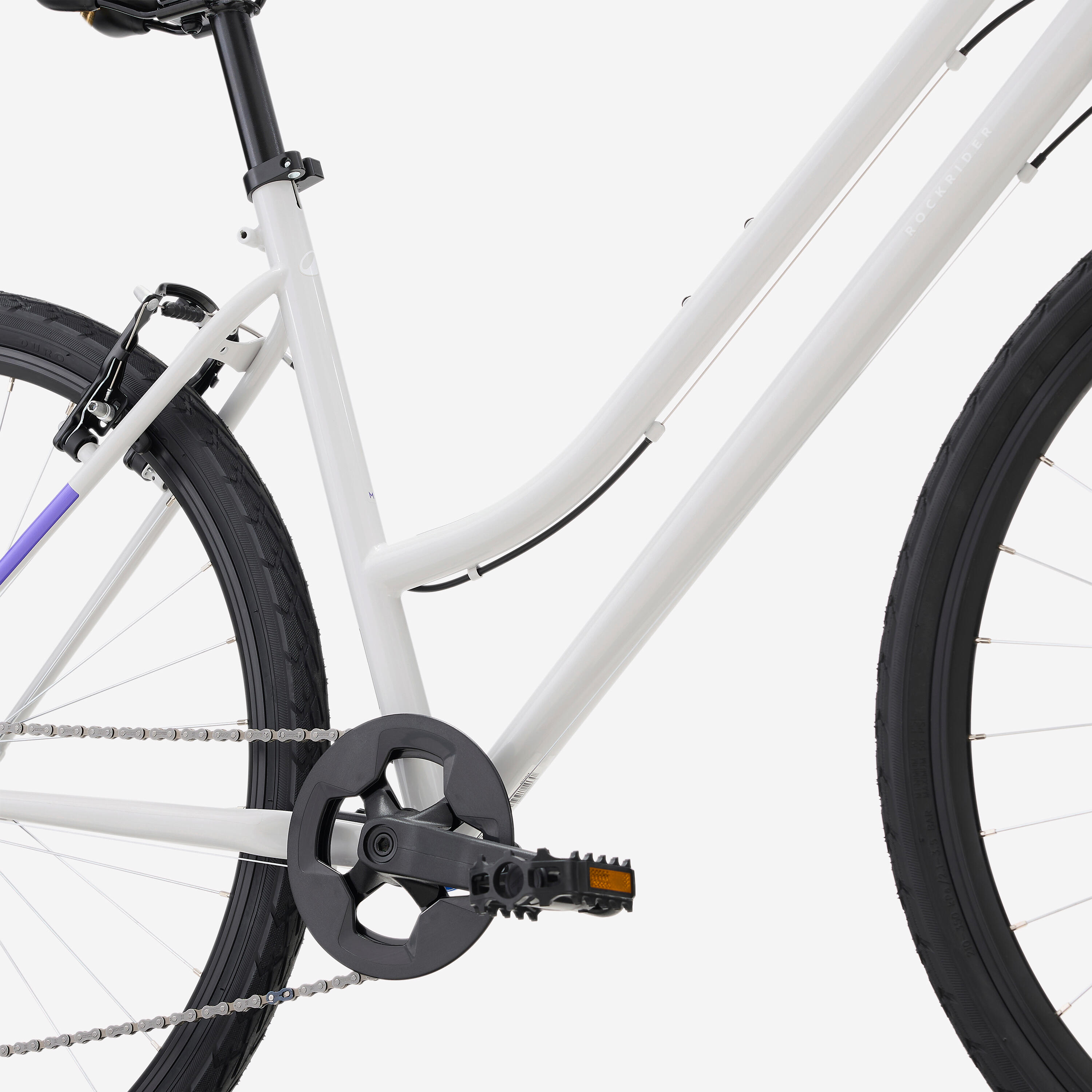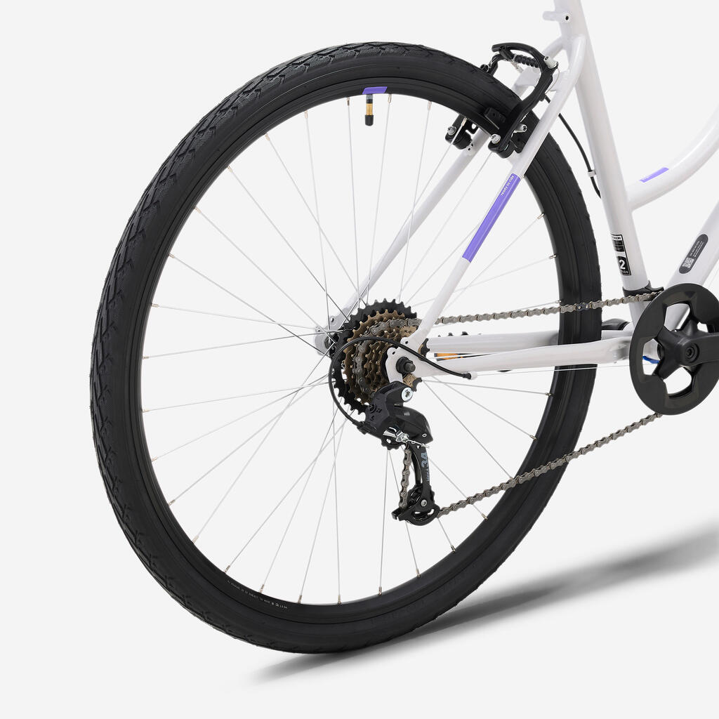 Rockrider Trekking EXPL 50 je opremljen z udobnimi pnevmatikami, ki vas popeljejo po cestah in poteh. Mere: 700 x 47 (47-622).Priporočen tlak je najmanj 2 bar in največ 4 bar (podrobnosti na bočnici).
