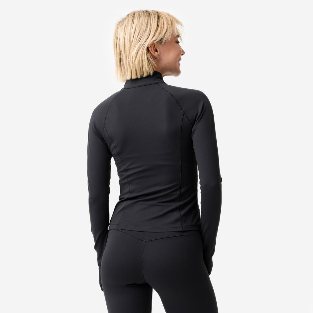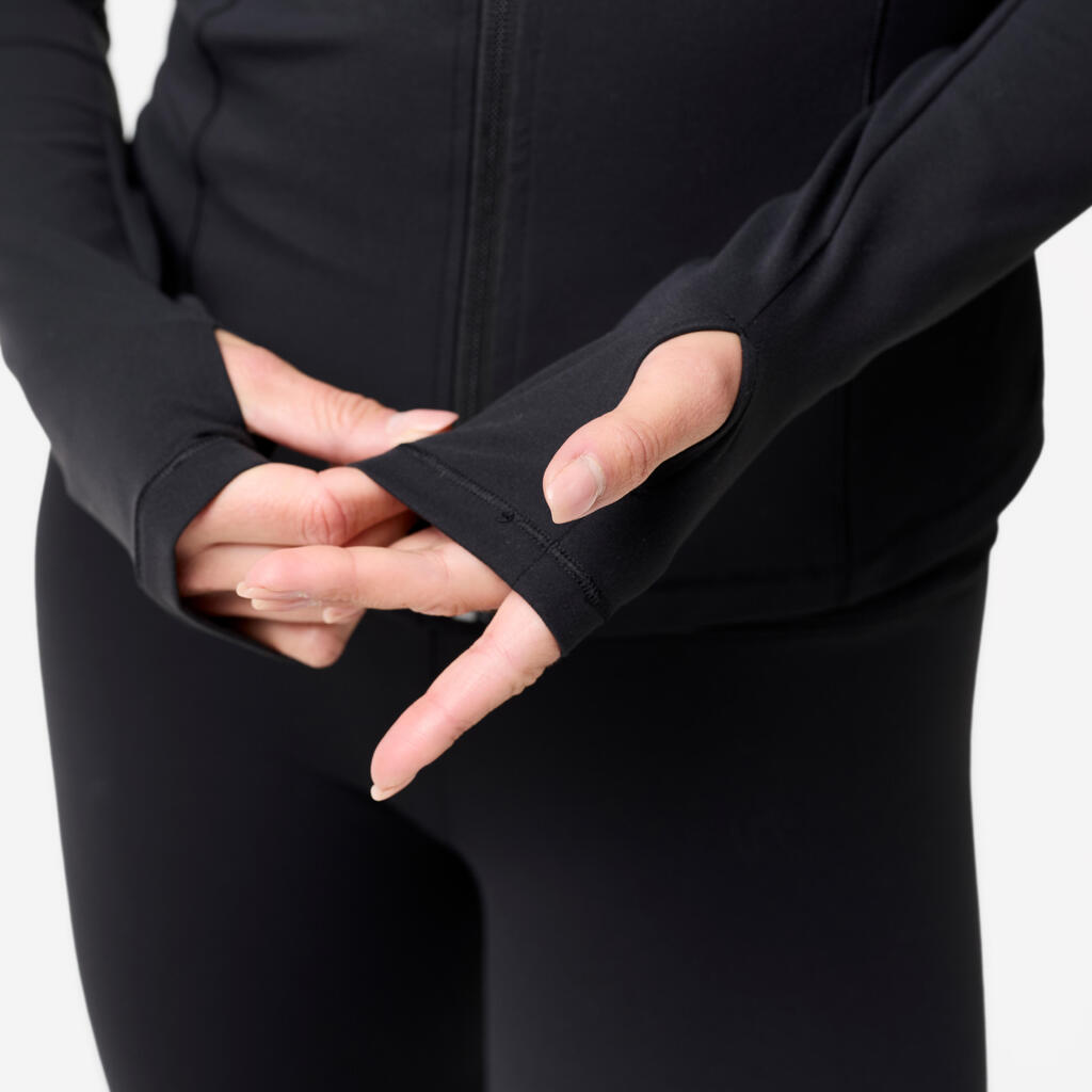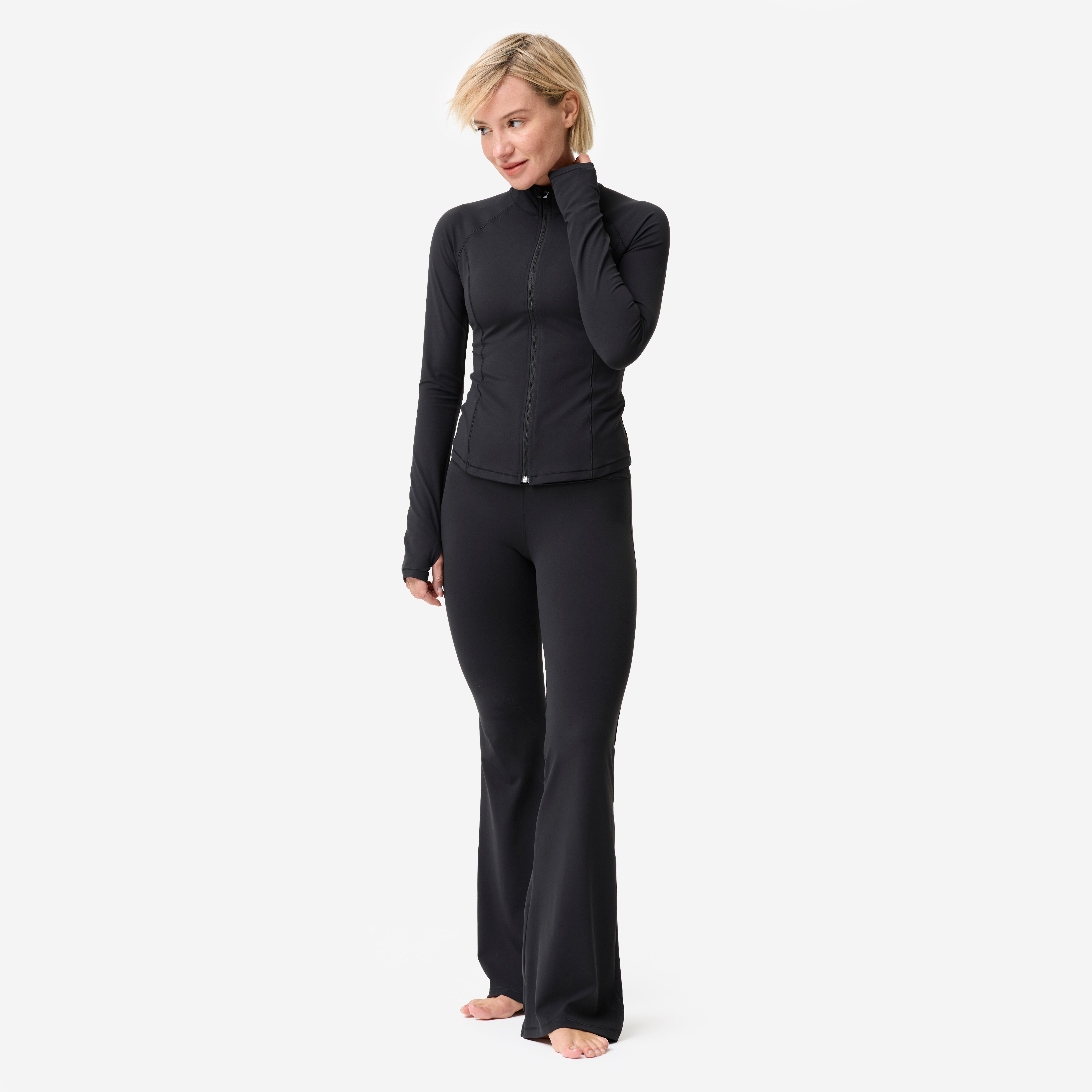 Sestava vključuje visokih 20 % elastana za raztezanje tkanine. To raztezanje omogoča jakni, da sledi vsem gibom med jogo in pilatesom brez vlečenja ali omejevanja. Roke se dvignejo, prsi zasučejo, hrbet upogne: jakna sledi vsakemu gibu brez upora.