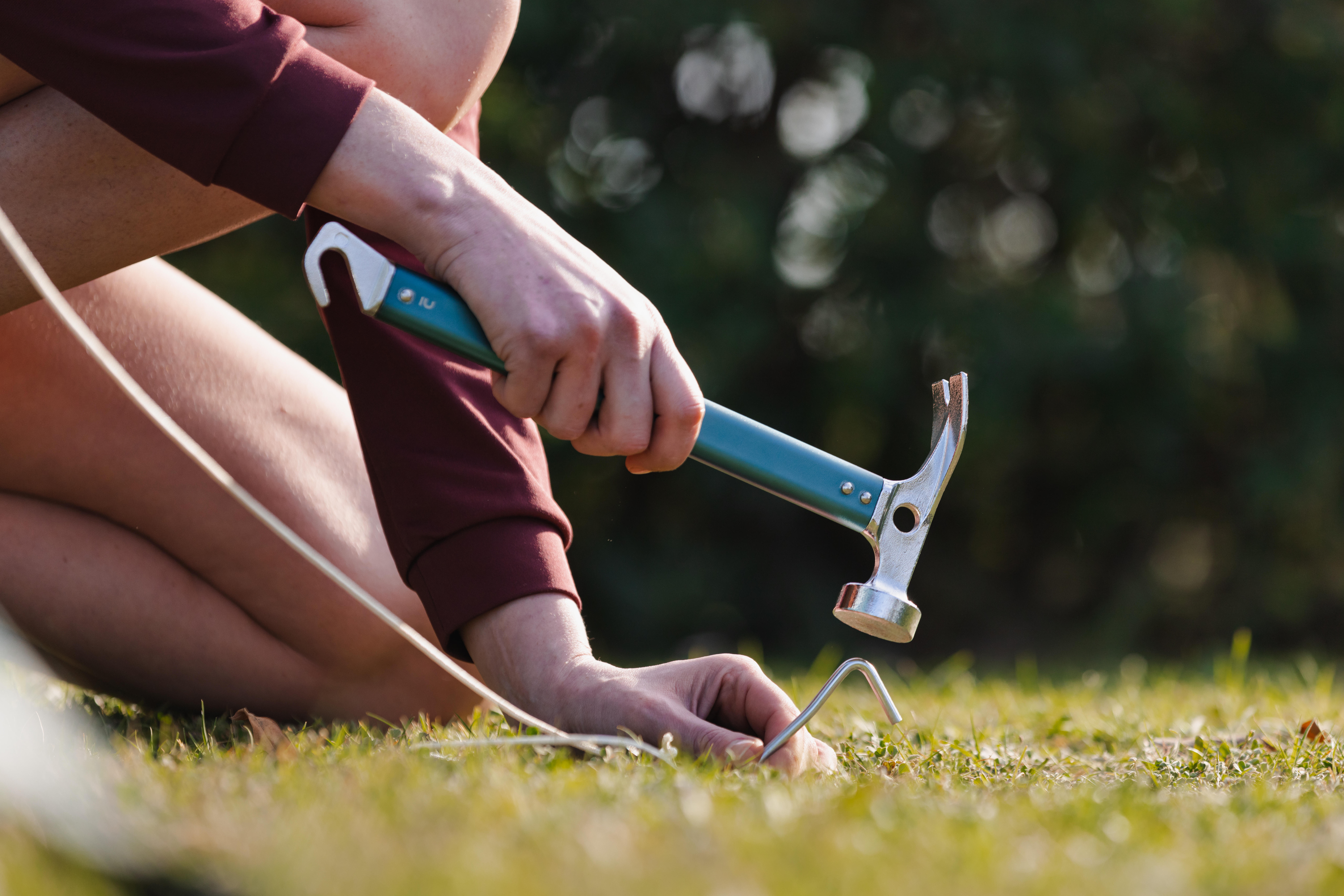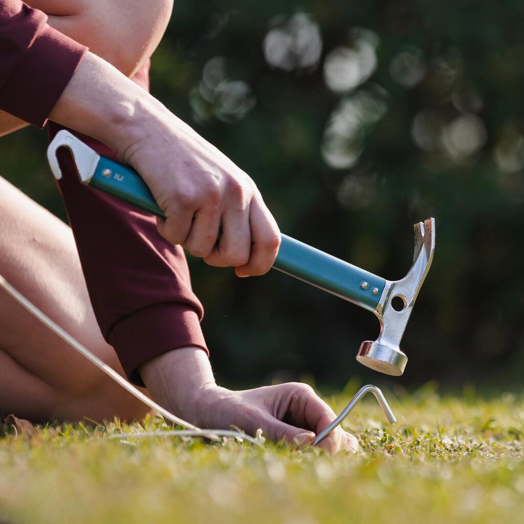 14-centimetrski klini iz recikliranega jekla omogočajo pritrditev šotora na tla.