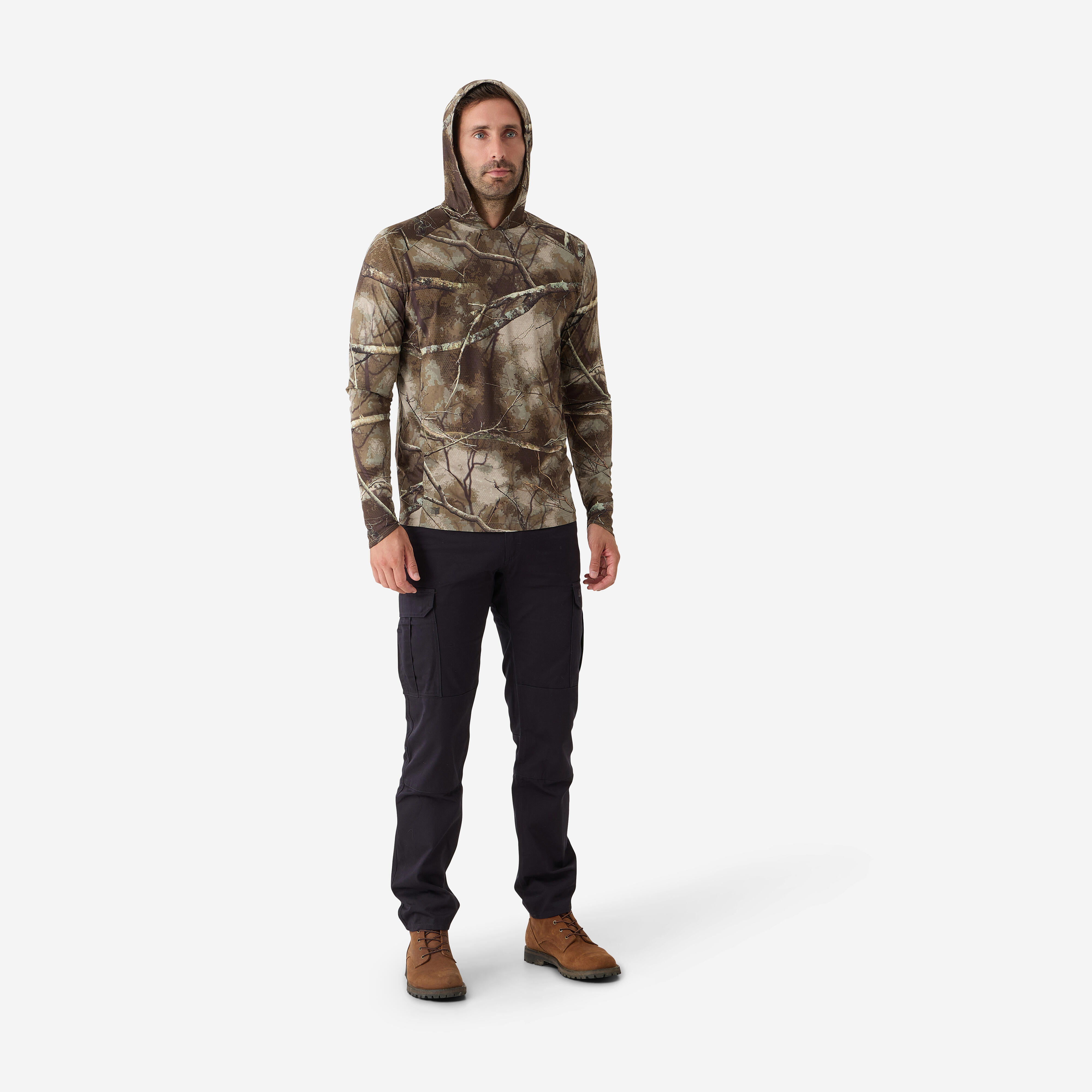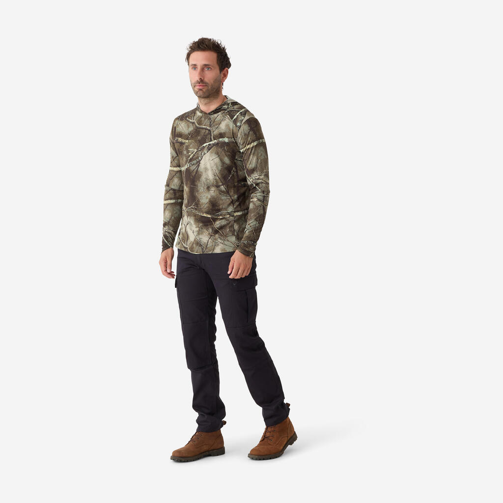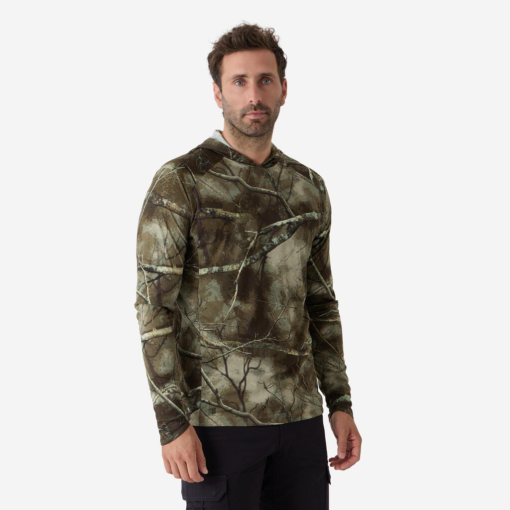 Majica ima kapuco za boljšo zaščito vratu in lobanje, spodnji del rokavov pa je podaljšan, da bolje prekrije hrbtno stran roke. Kroj je precej ohlapen, zato se boste pri vseh gibih počutili udobno.Kroj je precej ohlapen, zato se boste pri vseh gibih počutili udobno.Tudi če se oblačilo zmoči (zaradi vode ali potu), se material hitro posuši, kar je odlično, ko ste več ur na lovu, še posebej, ko se bliža poletje.