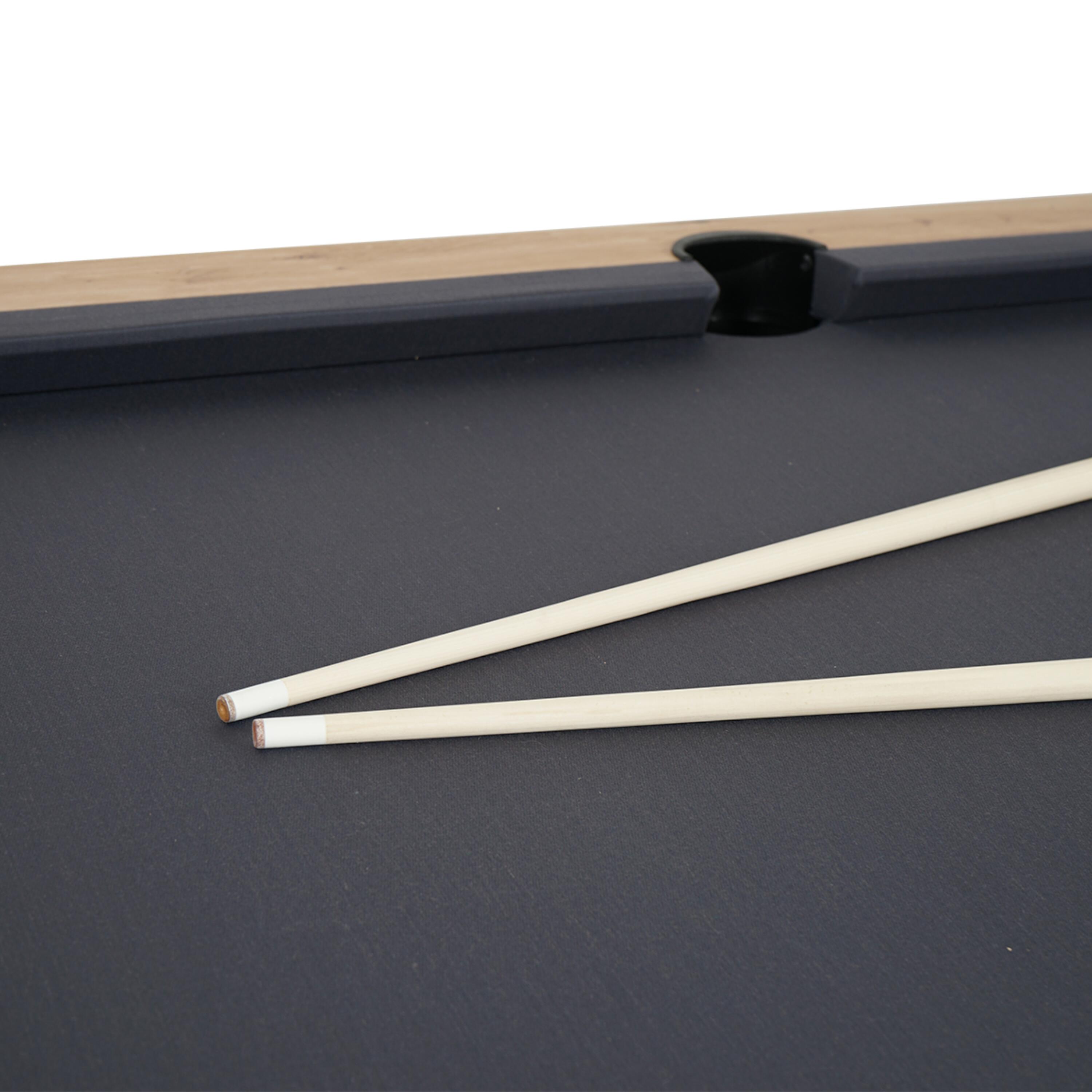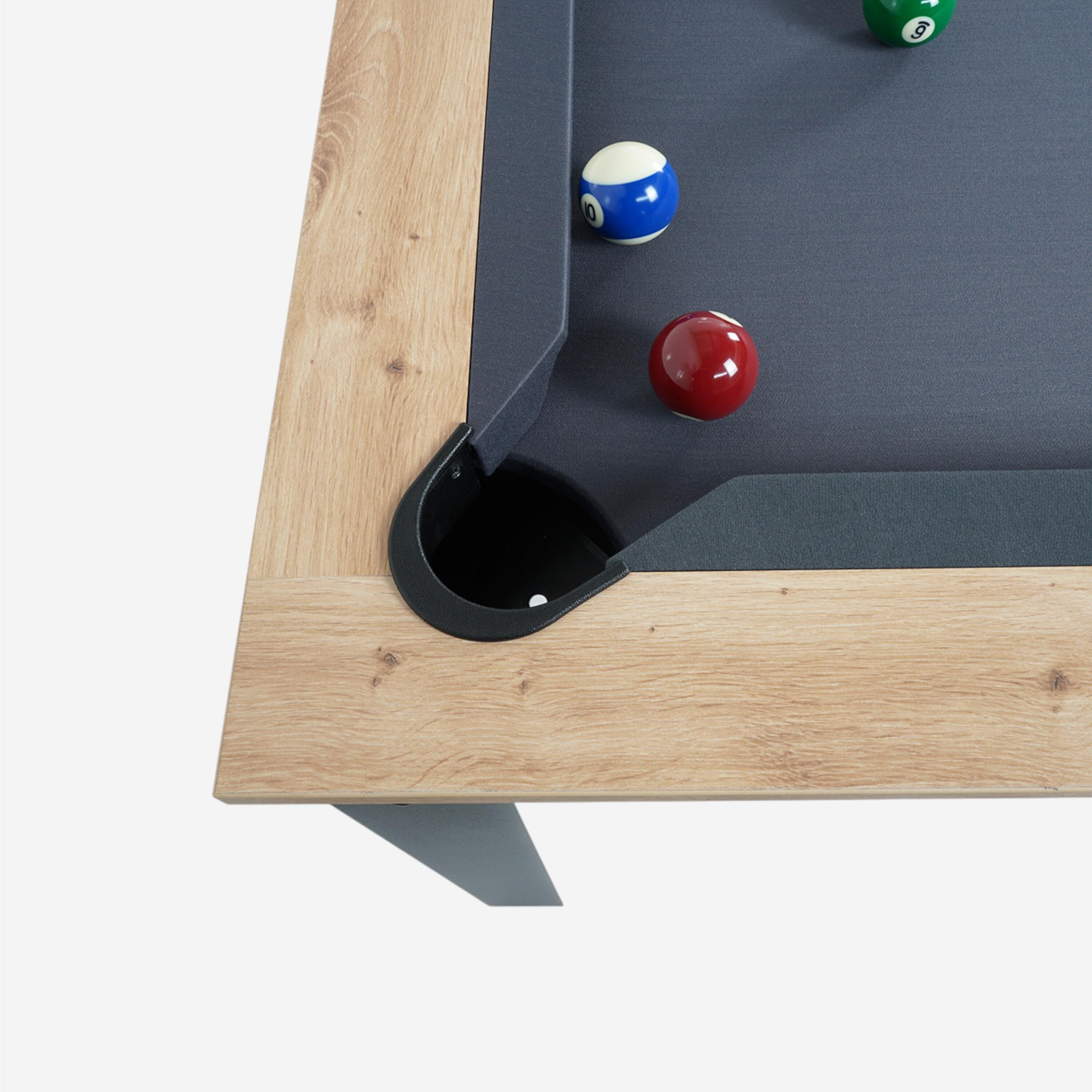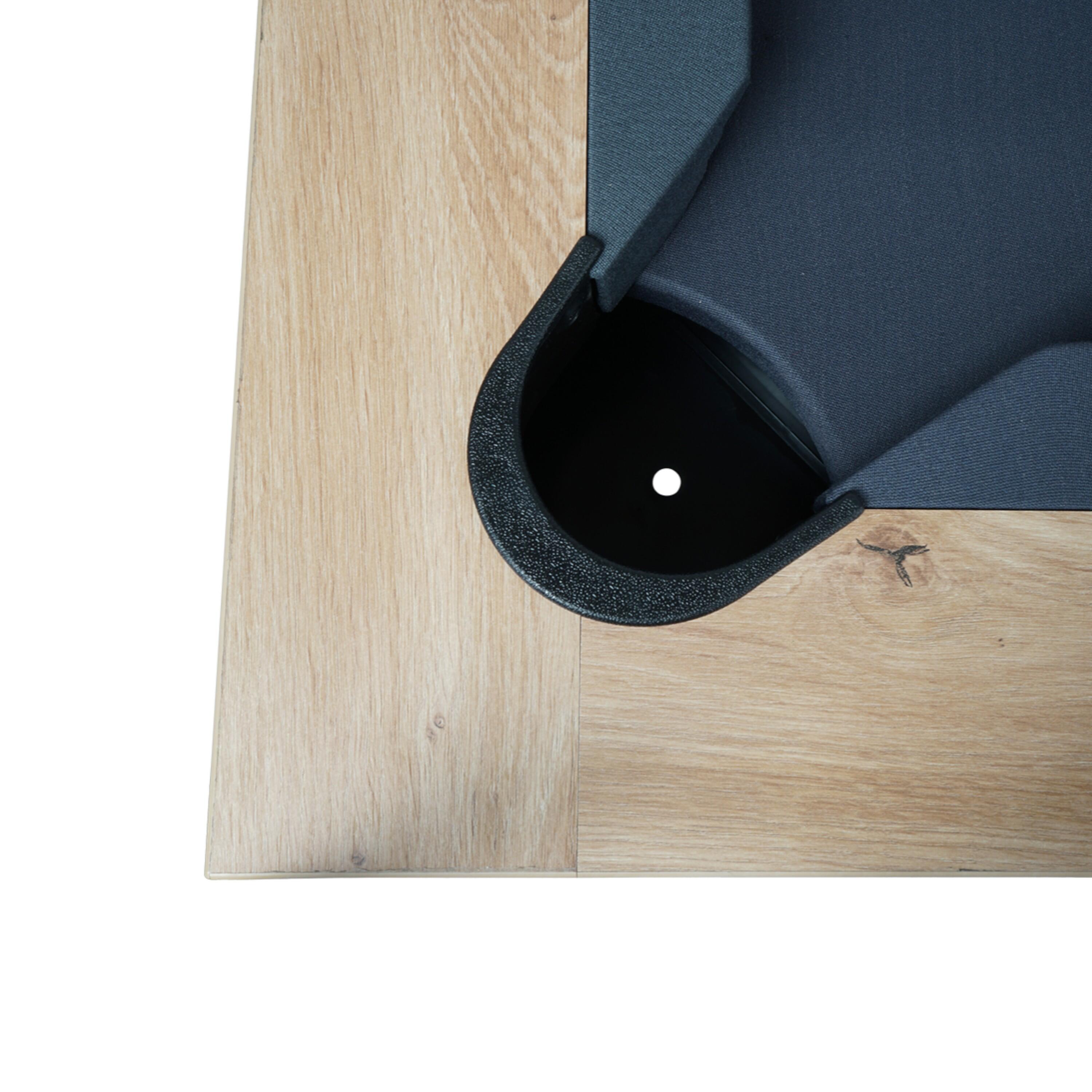 25 mm debele melaminske plošče v hrastovem slogu.Igralna površina iz iverne plošče 19 mm (obložena).Leseni trakovi + visokozmogljiva guma (obložena).Profesionalno obložena (volna in sintetika).Kovinske noge mize, prevlečene s črno epoksidno barvo.Nastavljive nogice pod vsako nogo mize.
