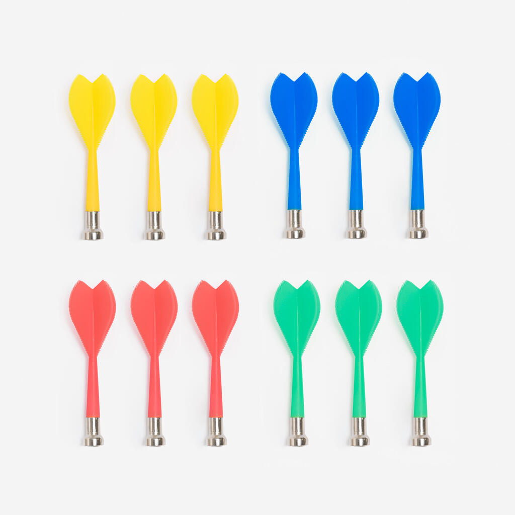 Priloženih je 12 magnetnih puščic. Puščice v 4 različnih barvah. Priložen je samolepilni stenski nosilecVse je pripravljeno za igranje takoj, ko odprete komplet.