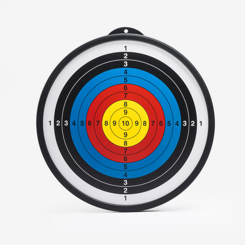 Dvostranska kovinska tarča. Ena stran ima pikado. Druga stran ima koncentrične cone.