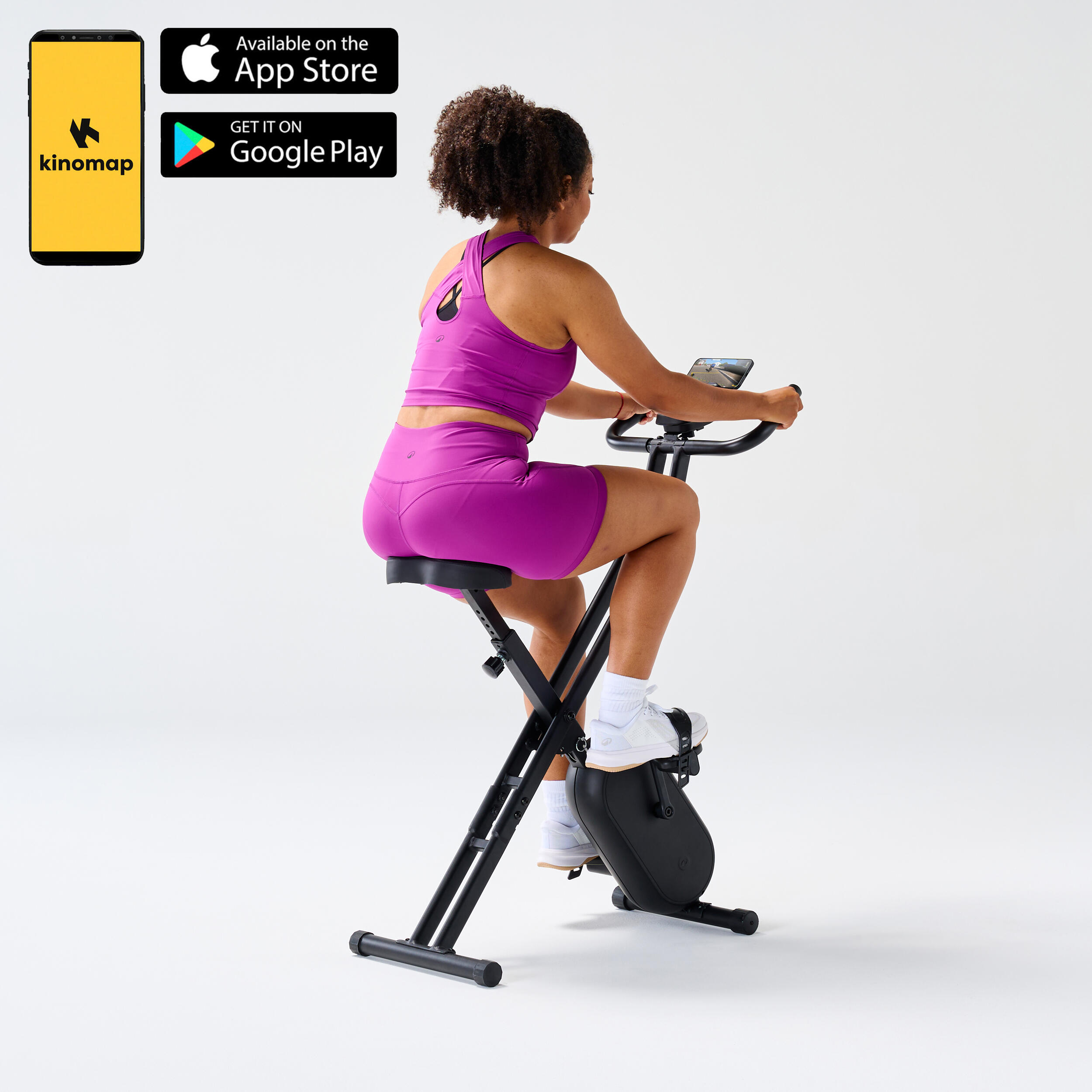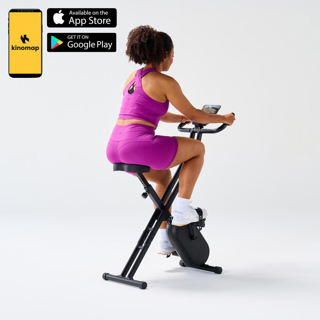 To kolo vsem omogoča dostop do fitnesa po dostopni ceni. Naše ekipe so ga zasnovale tako, da združuje kakovost in enostavno uporabo. Bluetooth povezava omogoča, da s pomočjo prikaznih videov sledite vodenim vadbenim programom v Kinomap. Skenirajte QR kodo in odkrijte vse možnosti. Prav tako lahko prilagodite napor med 10 stopnjami vzdržljivosti in napredujete po svojem ritmu. Senzorji na krmilu merijo vaš srčni utrip v realnem času.