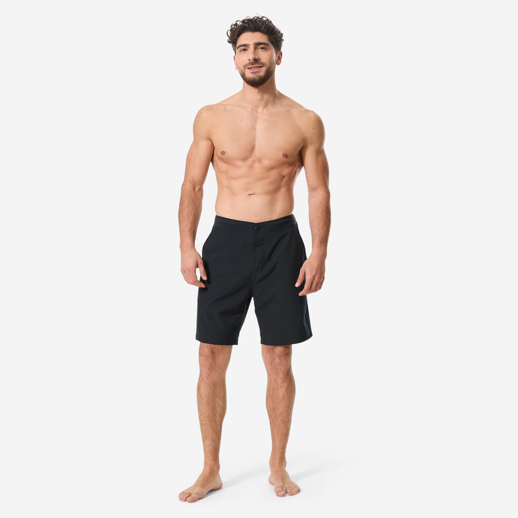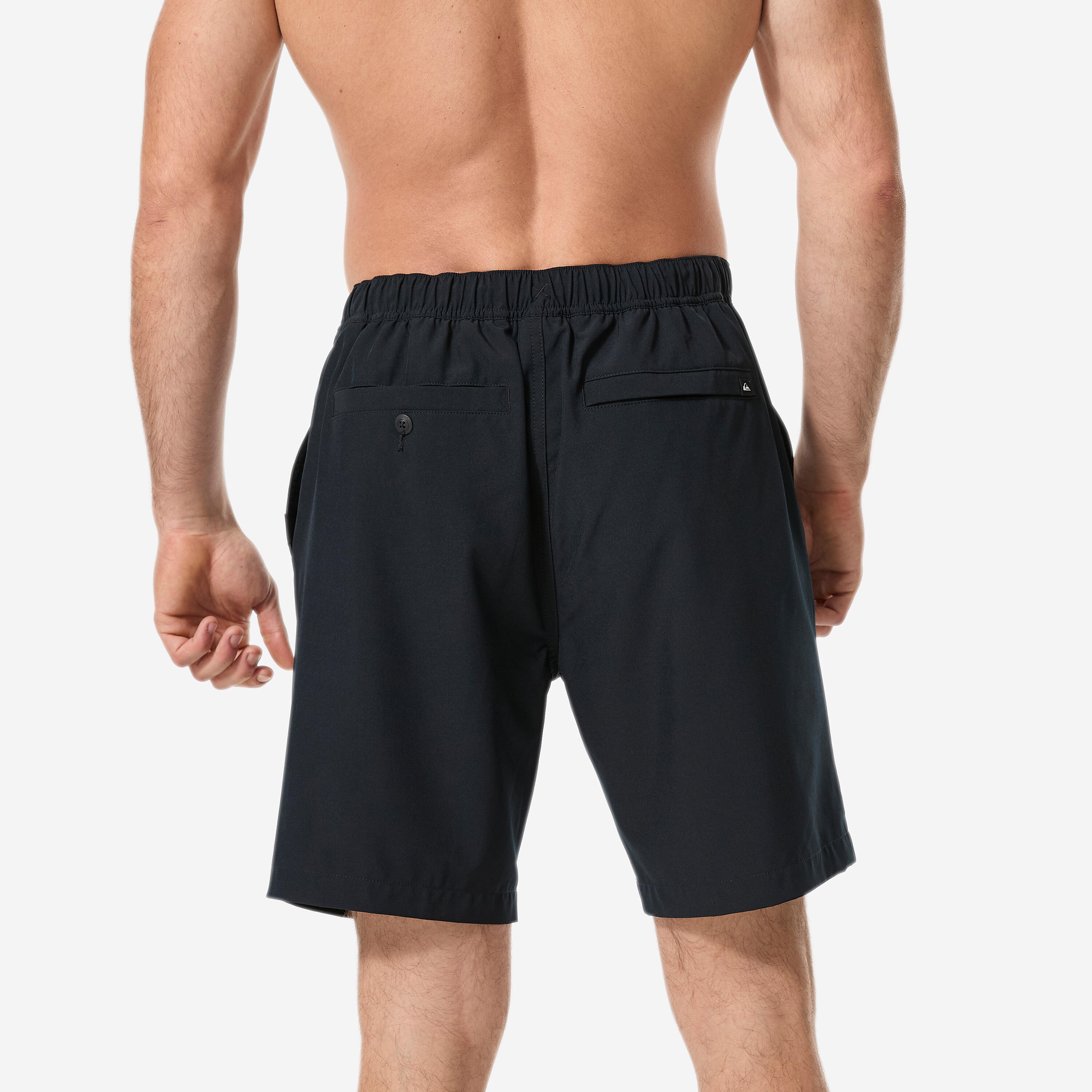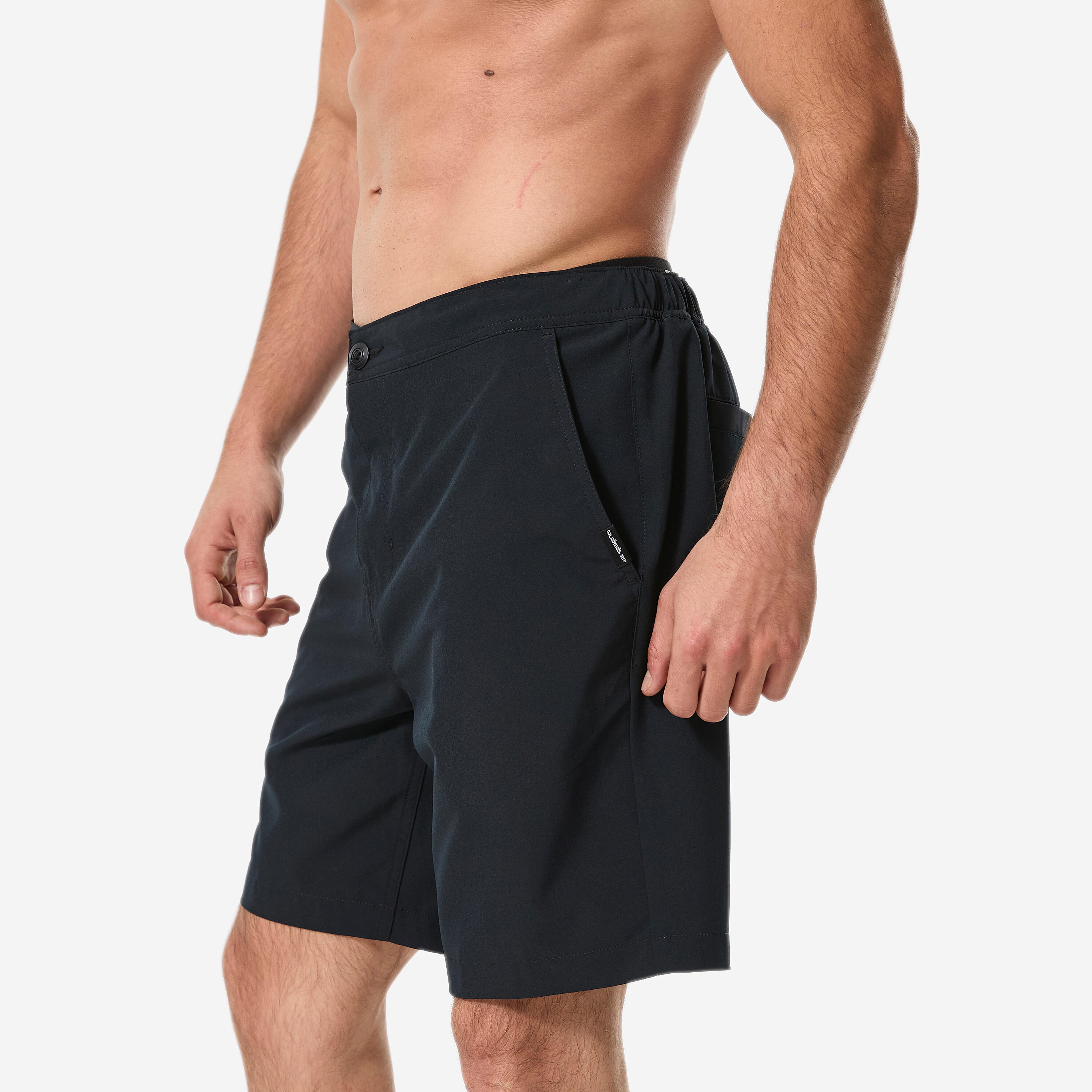 Daljše kratke hlače z delno elastičnim pasom. Stranska žepa in zadnji žep.