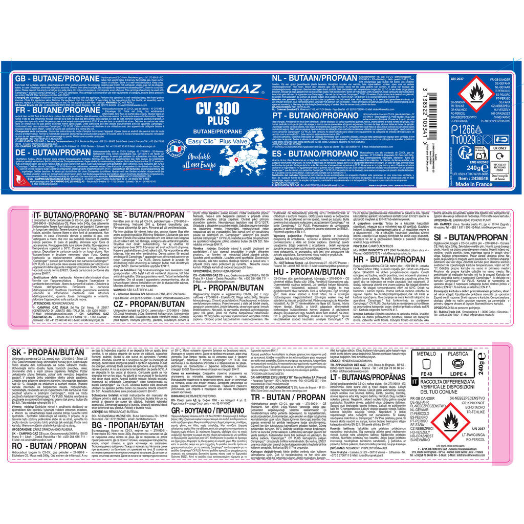 Deluje pri temperaturah do +5 °C. Prostornina: 240 g butana/propana. Teža: 411 g. Premer: 9,3 cm. / Višina: 10 cm.