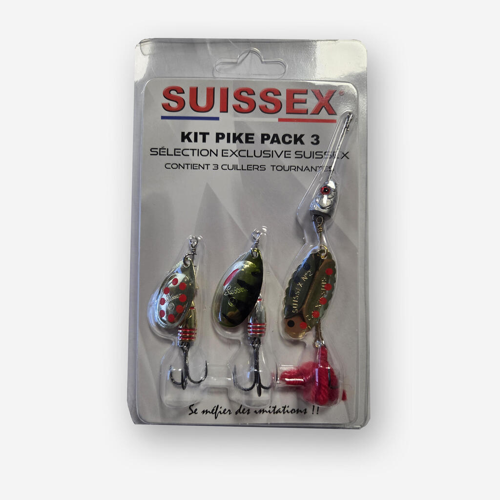 Komplet za ribolov ščuk Suissex Pike Kit vsebuje izbor močnih, vibrirajočih kovinskih blestivk za čiste in močne napade.