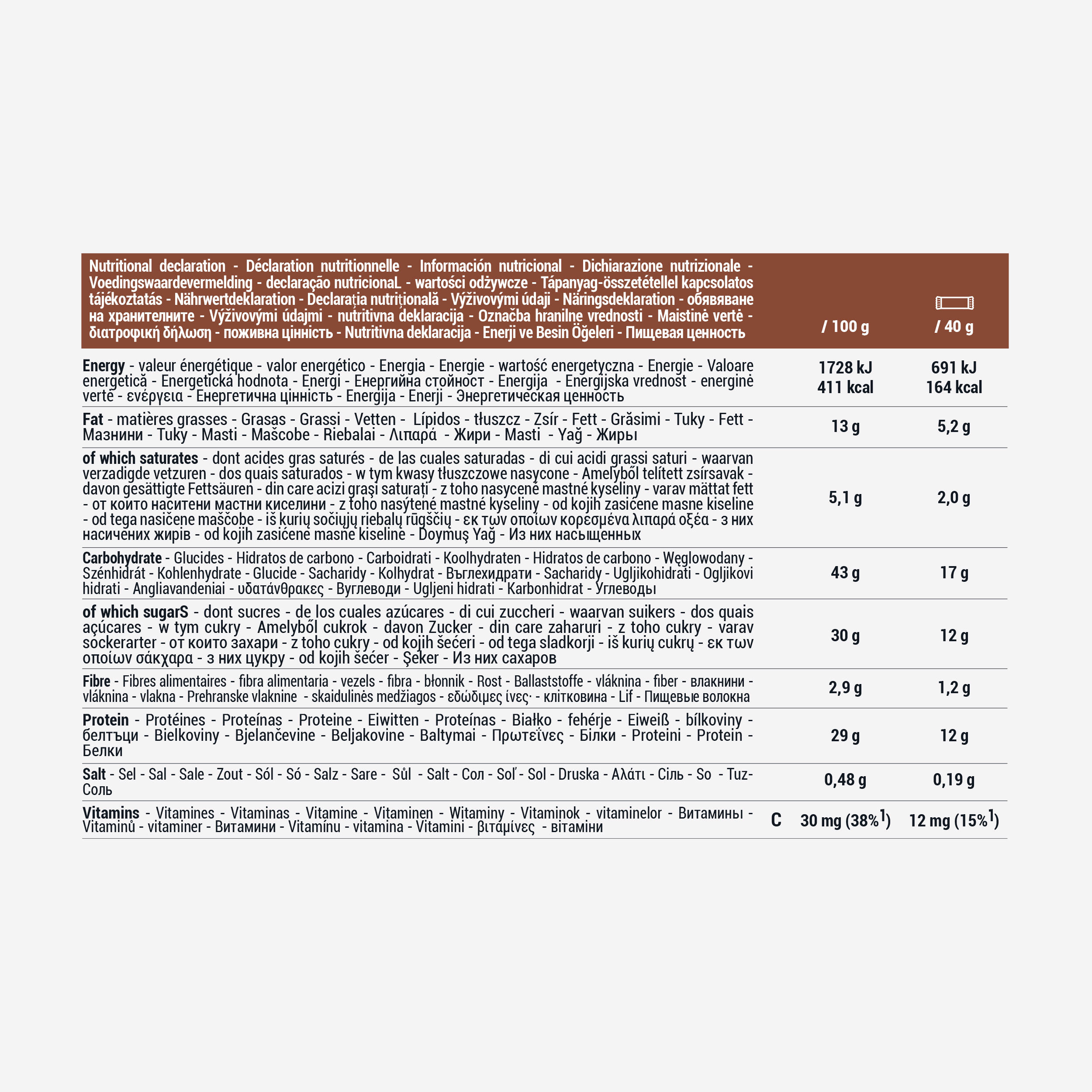 Sestavine: Pšenični sirup, tekoča mlečna čokolada in zrna 22 % (sladkor, kakavovo maslo, polnomastno mleko v prahu, kakavova masa, emulgator: sojin in sončnični lecitin, naravna aroma vanilje), hrustljave beljakovine graha 19 % (beljakovine graha in pšenice, tapioka škrob), ekstrudirane mlečne beljakovine 9 %, ovseni otrobi, izolat beljakovin graha 3,8 %, sončnično olje, kakav v prahu z nizko vsebnostjo maščob 1,9 %, kakavov izvleček, emulgator: sojin lecitin, vitamin C, antioksidant: izvleček, bogat s tokoferolom. Lahko vsebuje sledove: arašidov in oreščkov.