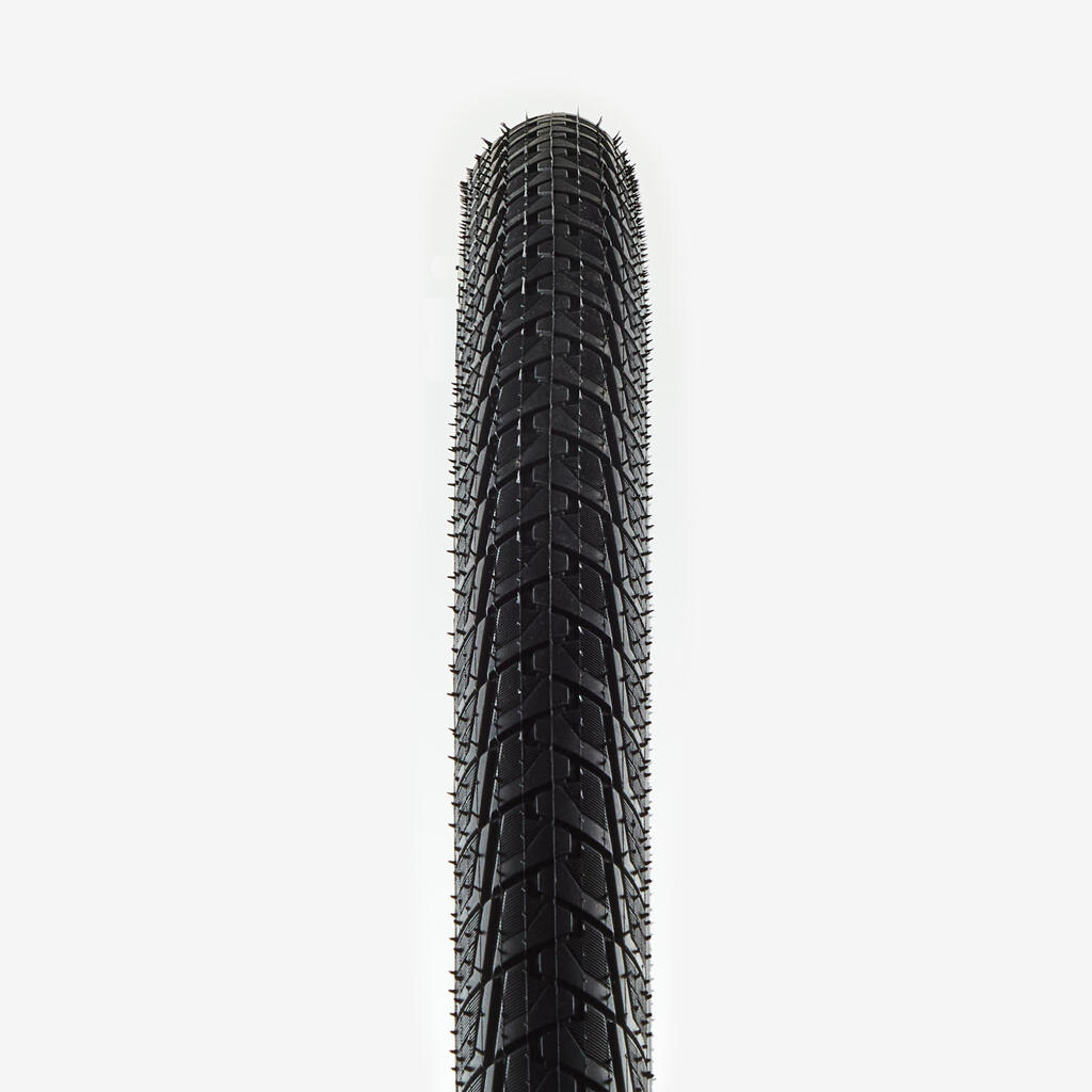 Najprej odstranite kolo in spustite zrak iz pnevmatike. Pritisnite na bočnice pnevmatike, da jih odstranite z platišča. Uporabite Decathlonovo orodje za pnevmatike (ref. 8930710). Vstavite enega pod pnevmatiko, da jo izvlečete. Pritrdite ga na napero in ponovite postopek, da sprostite eno celotno stran pnevmatike.
