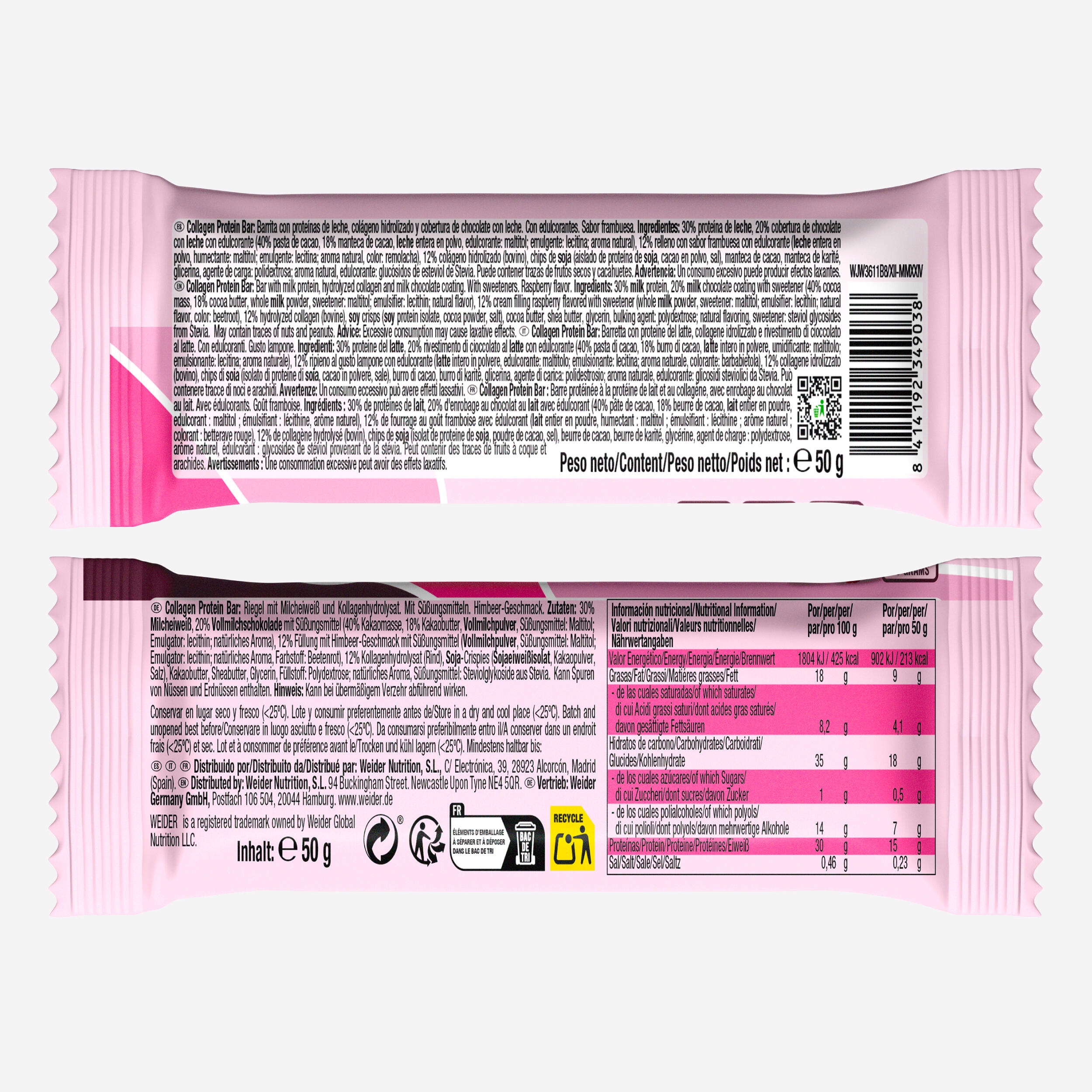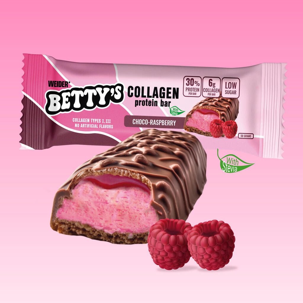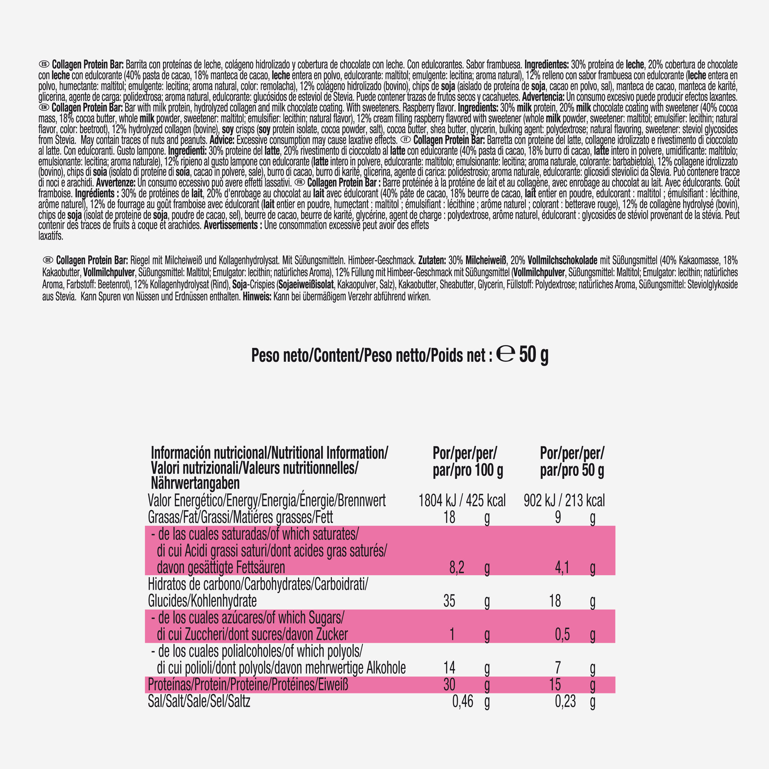 30 % mlečnih beljakovin, 20 % mlečne čokoladne obloge s sladilom (40 % kakavove mase, 18 % kakavovega masla, polnomastno mleko v prahu, sladilo: maltitol. emulgator: lecitin; naravna aroma), 12 % kreme z okusom maline s sladilom (polnomastno mleko v prahu, sladilo: maltitol. emulgator: lecitin; naravna aroma, barvilo: rdeča pesa), 12 % hidroliziranega kolagena (govejega izvora), sojine kroglice (izolat sojinih beljakovin, kakav v prahu, sol), kakavovo maslo, karitejevo maslo, glicerol, sredstvo za povečanje prostornine: polidekstroza; naravna aroma, sladilo: steviolni glikozidi iz stevije.
